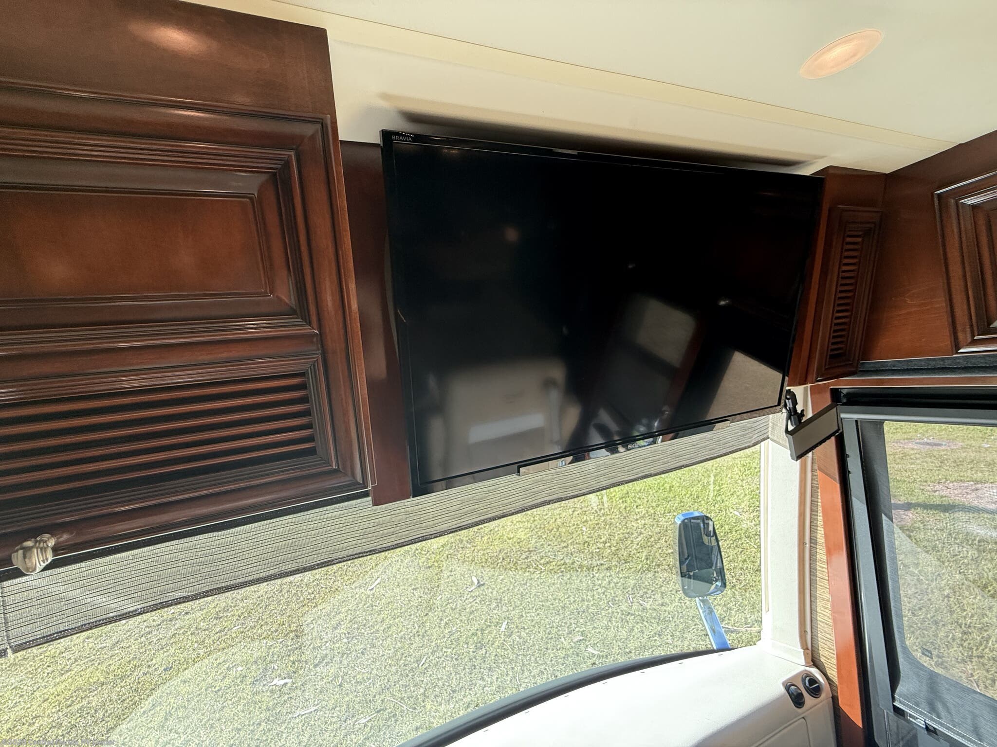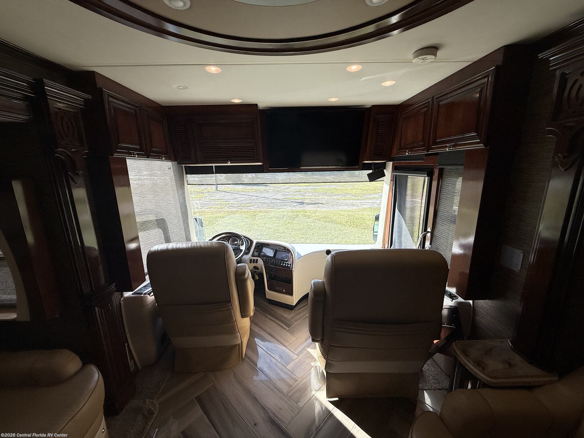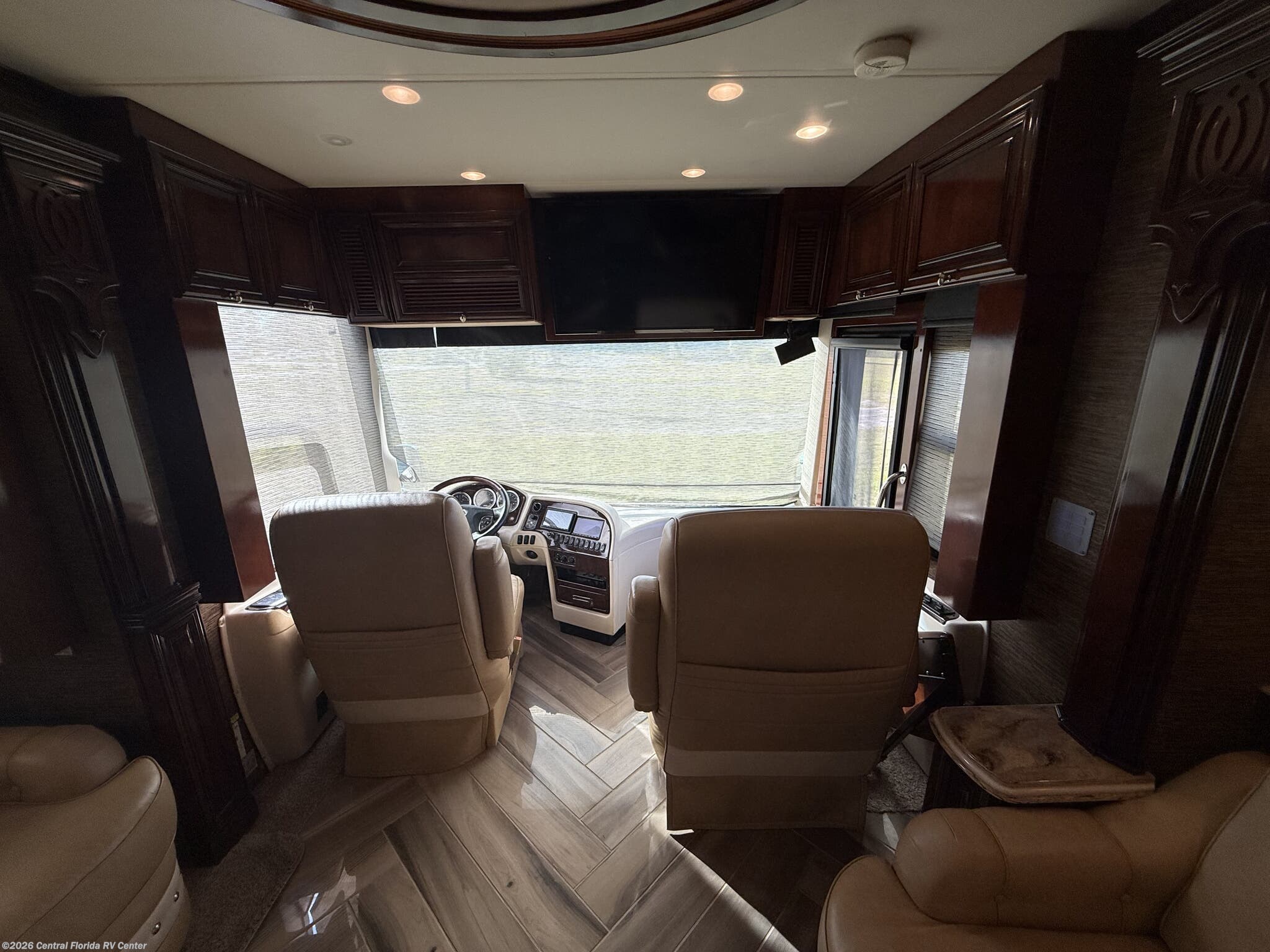 The standard features on this coach begin in the cockpit/interior with keyless entry, heated driver and passenger seats with power lumbar, recline, and footrest, passenger seat work station, auto motion power shades for windshield & driver/passenger side windows, power tilt and telescopic steering wheel, driver side power window, Comfort Drive steering, cruise control, convex exterior chrome mirrors with remote control, defrost, turn signals, dash radio with touch screen Rand McNally navigation and dual monitors, driver and side view cameras, remote control rearview color camera (option), tire pressure monitors, back up alarm and a 40” Sony LED TV in front overhead area (option).