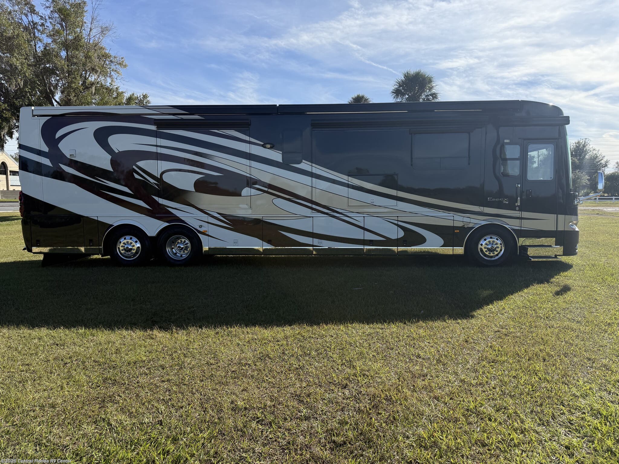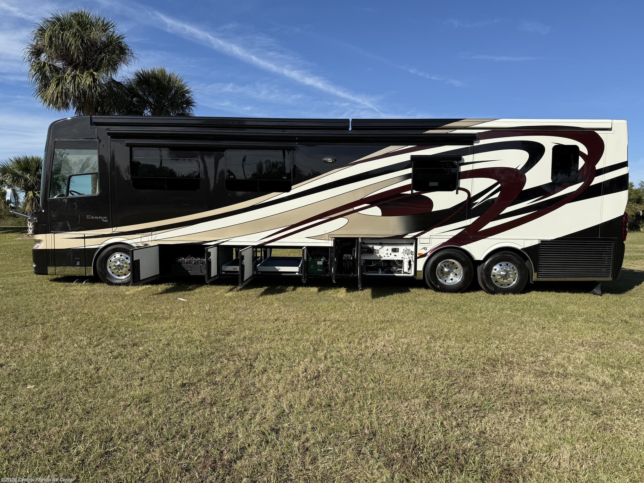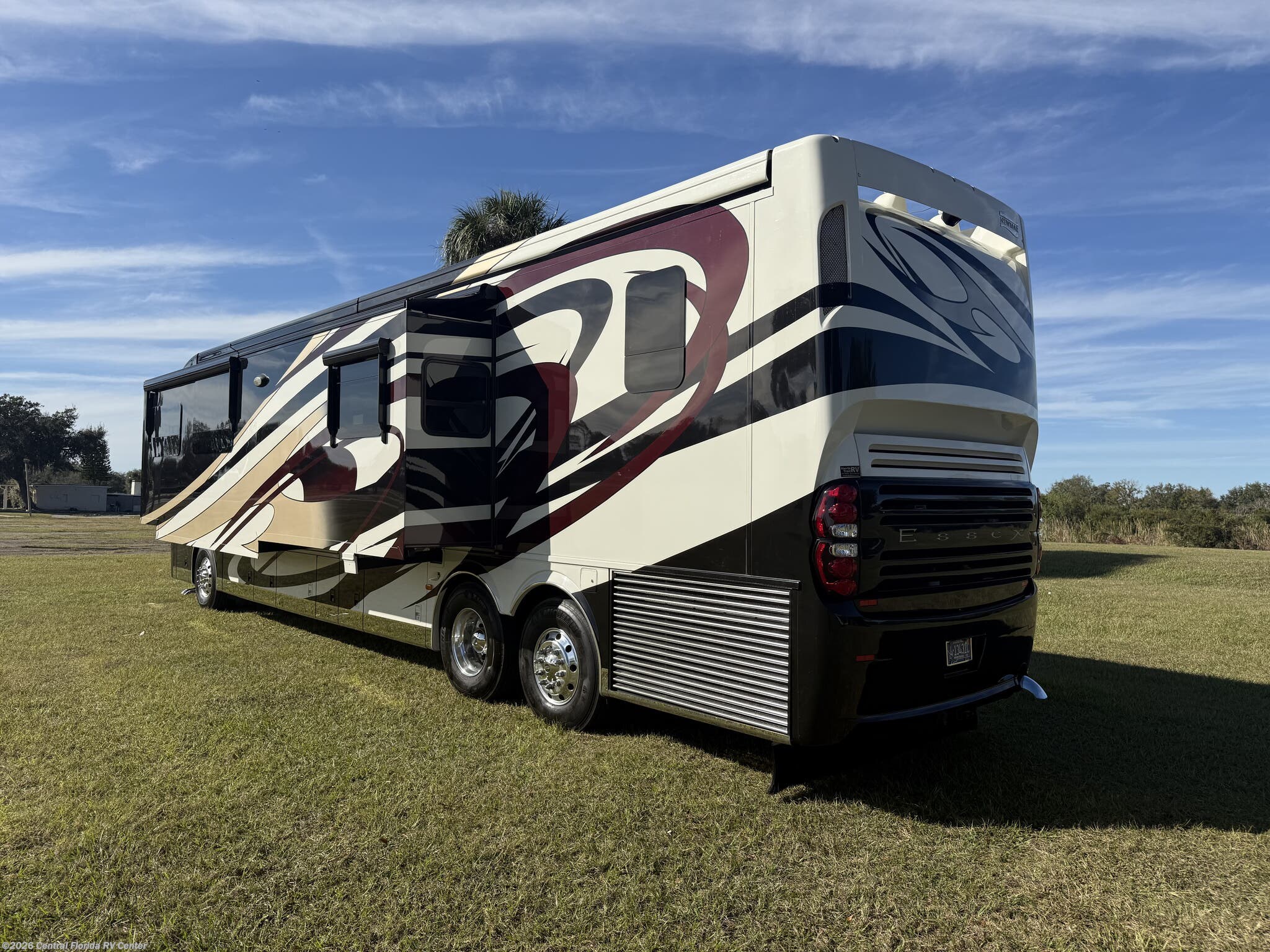 The standard features on this coach begin in the cockpit/interior with keyless entry, heated driver and passenger seats with power lumbar, recline, and footrest, passenger seat work station, auto motion power shades for windshield & driver/passenger side windows, power tilt and telescopic steering wheel, driver side power window, Comfort Drive steering, cruise control, convex exterior chrome mirrors with remote control, defrost, turn signals, dash radio with touch screen Rand McNally navigation and dual monitors, driver and side view cameras, remote control rearview color camera (option), tire pressure monitors, back up alarm and a 40” Sony LED TV in front overhead area (option).