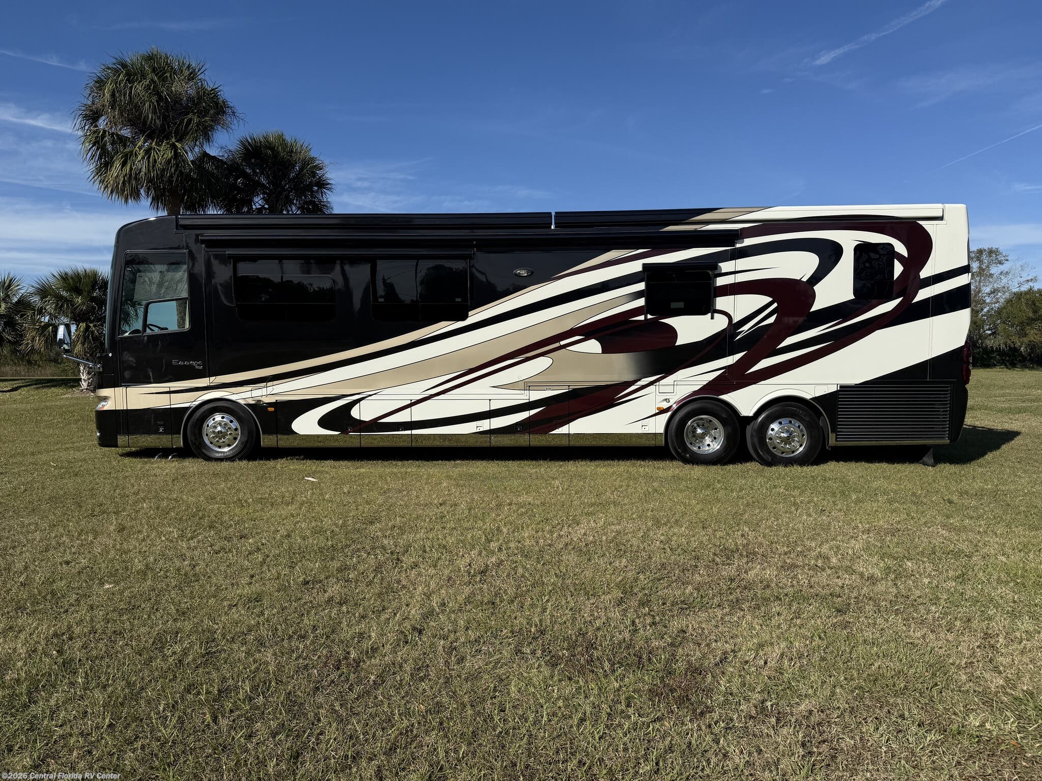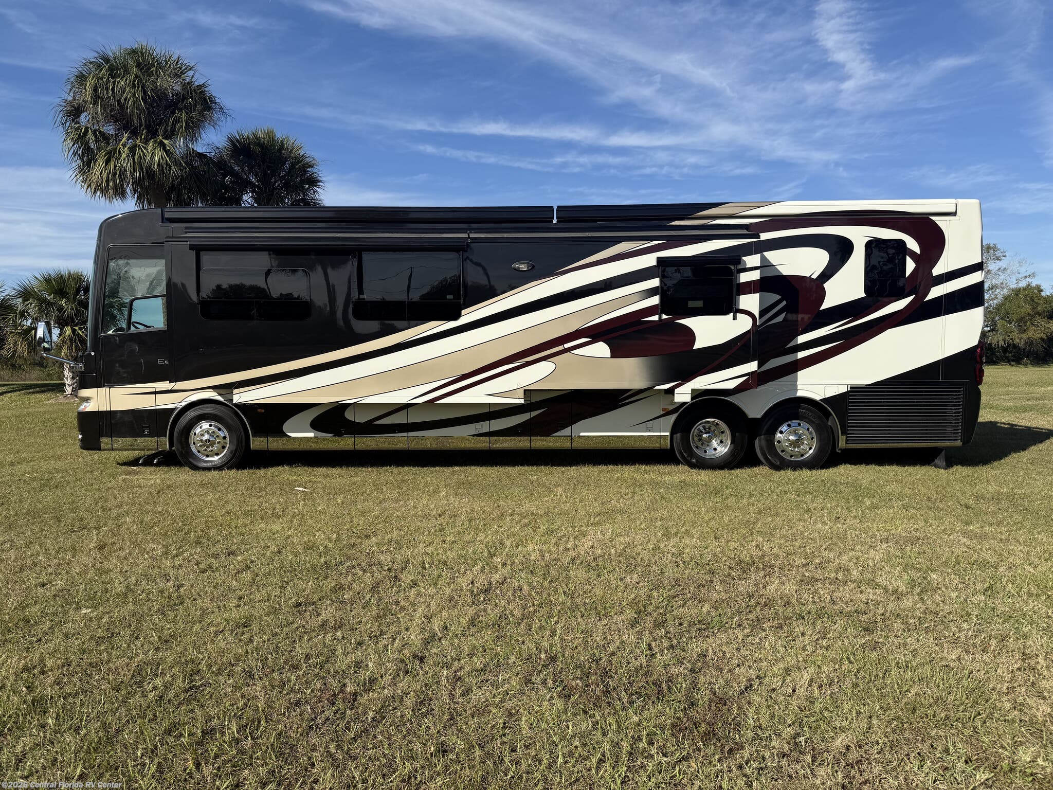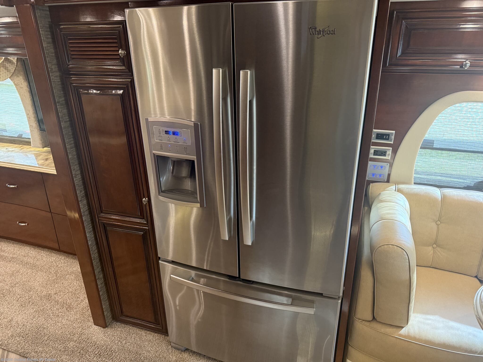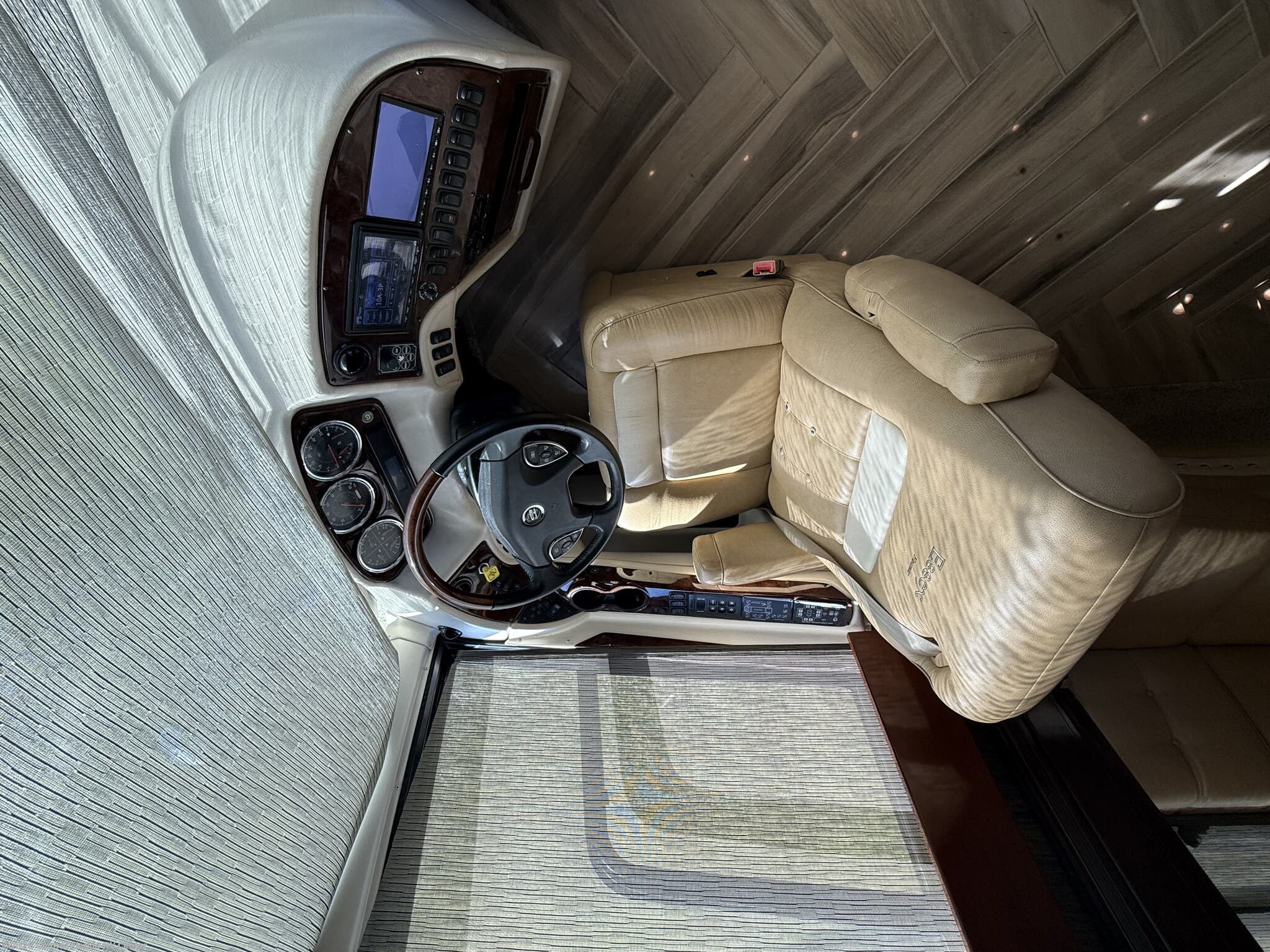 She looks stunning with her custom Poppy FBP, Dune interior, special order Ginger Glazed Maple Hi-Gloss Cabinets, stainless steel trim and Alcoa Dura-Brite aluminum wheels with Michelin tires that have less than 5,000 miles on them.