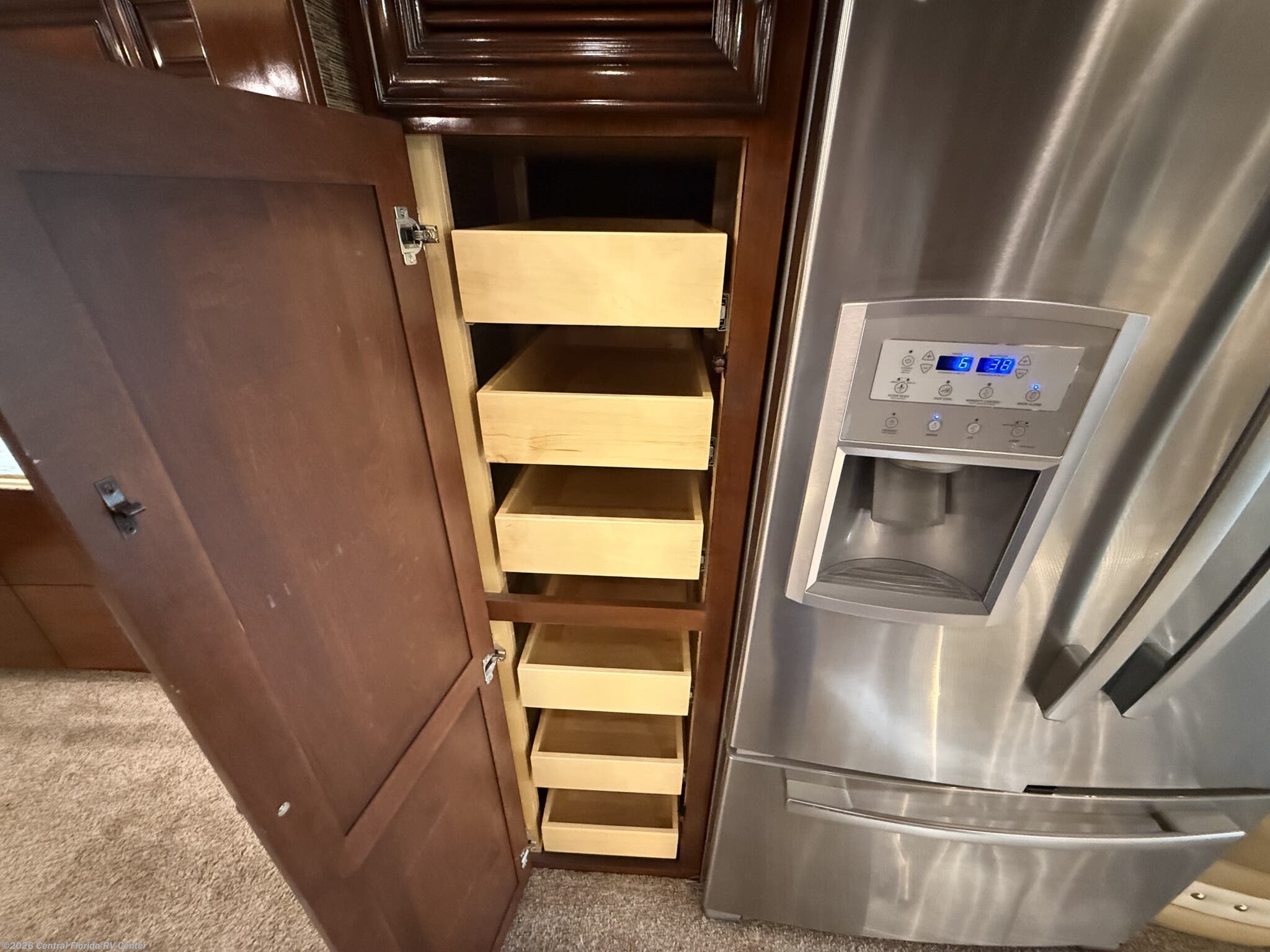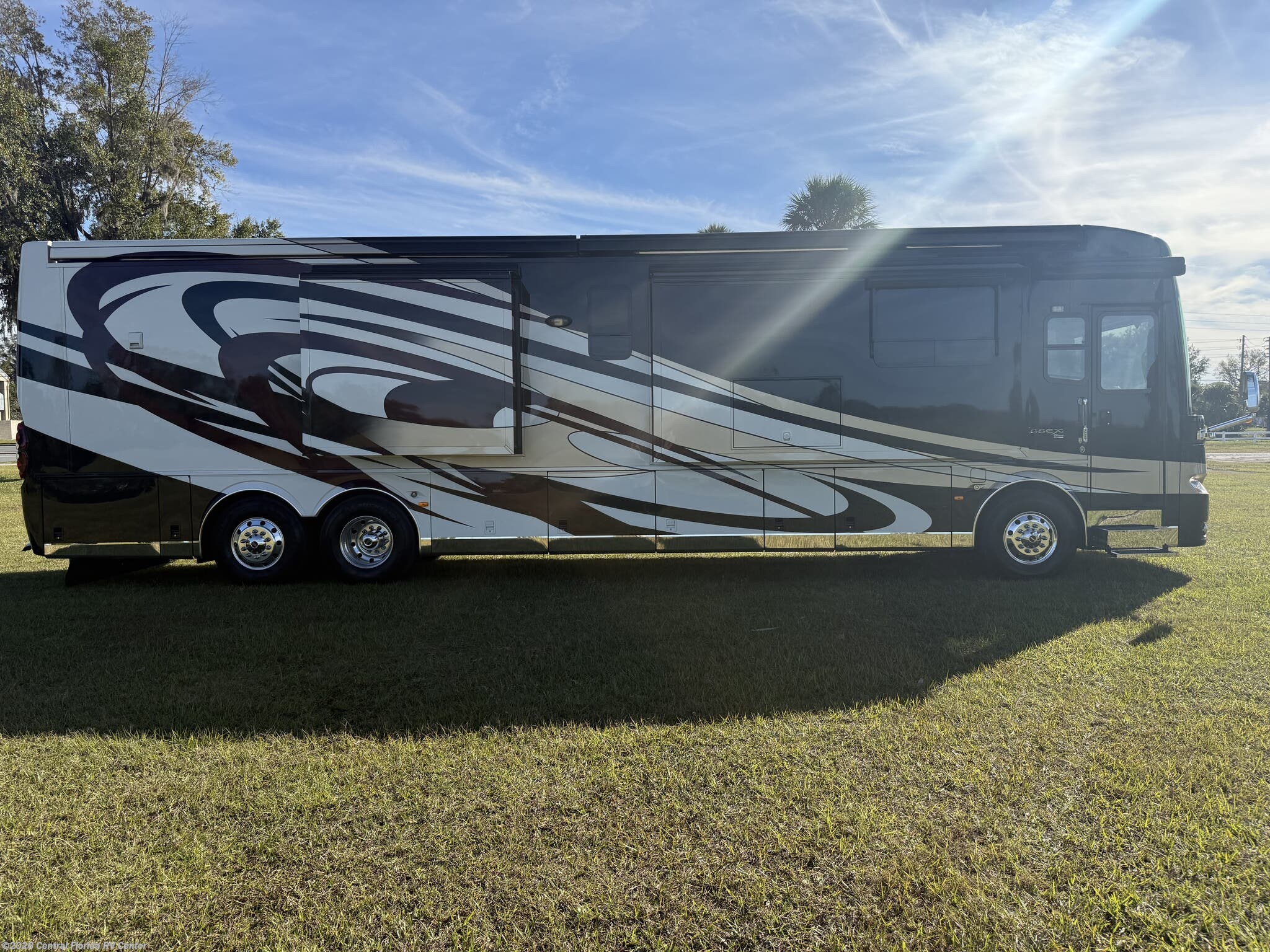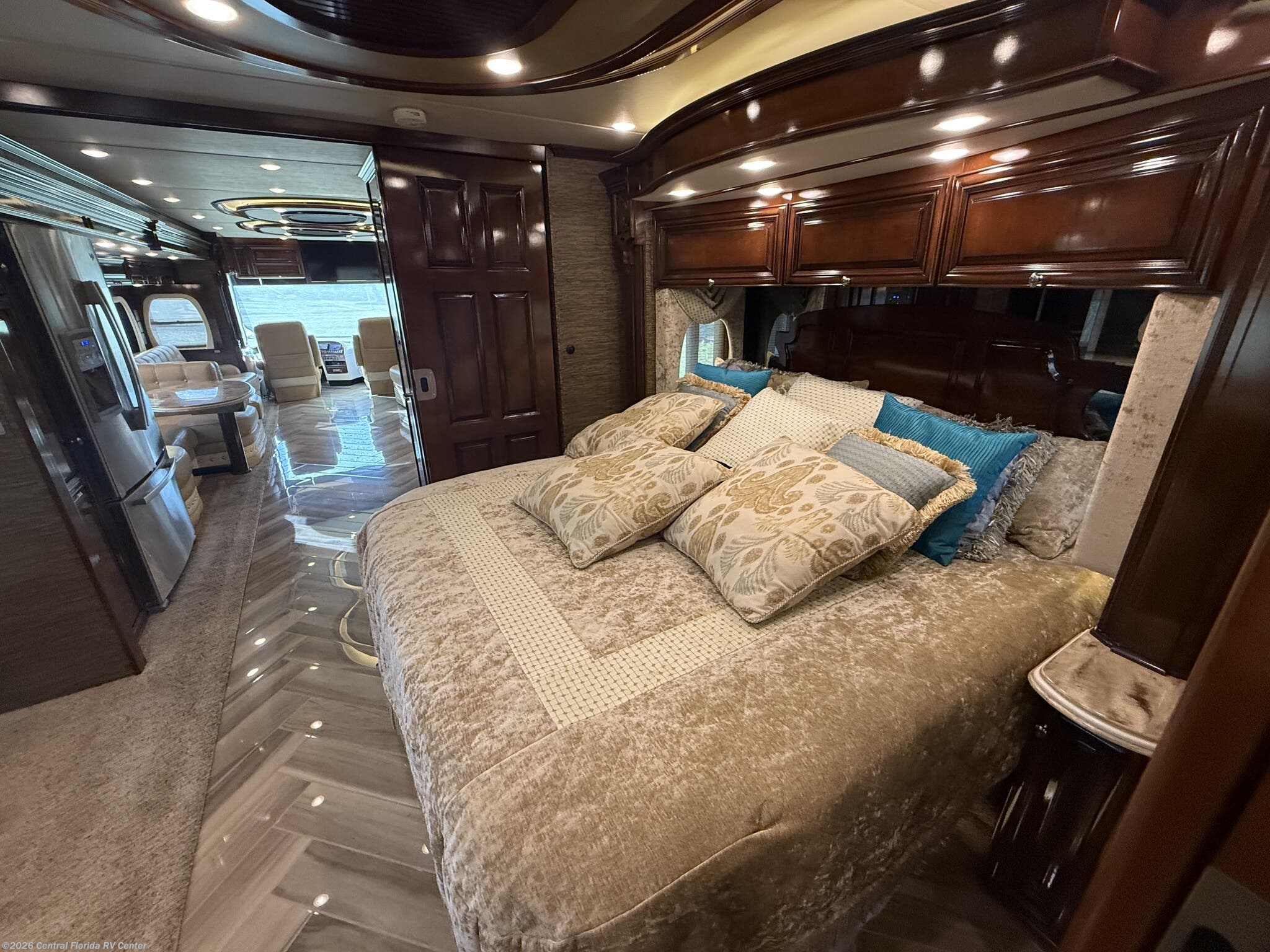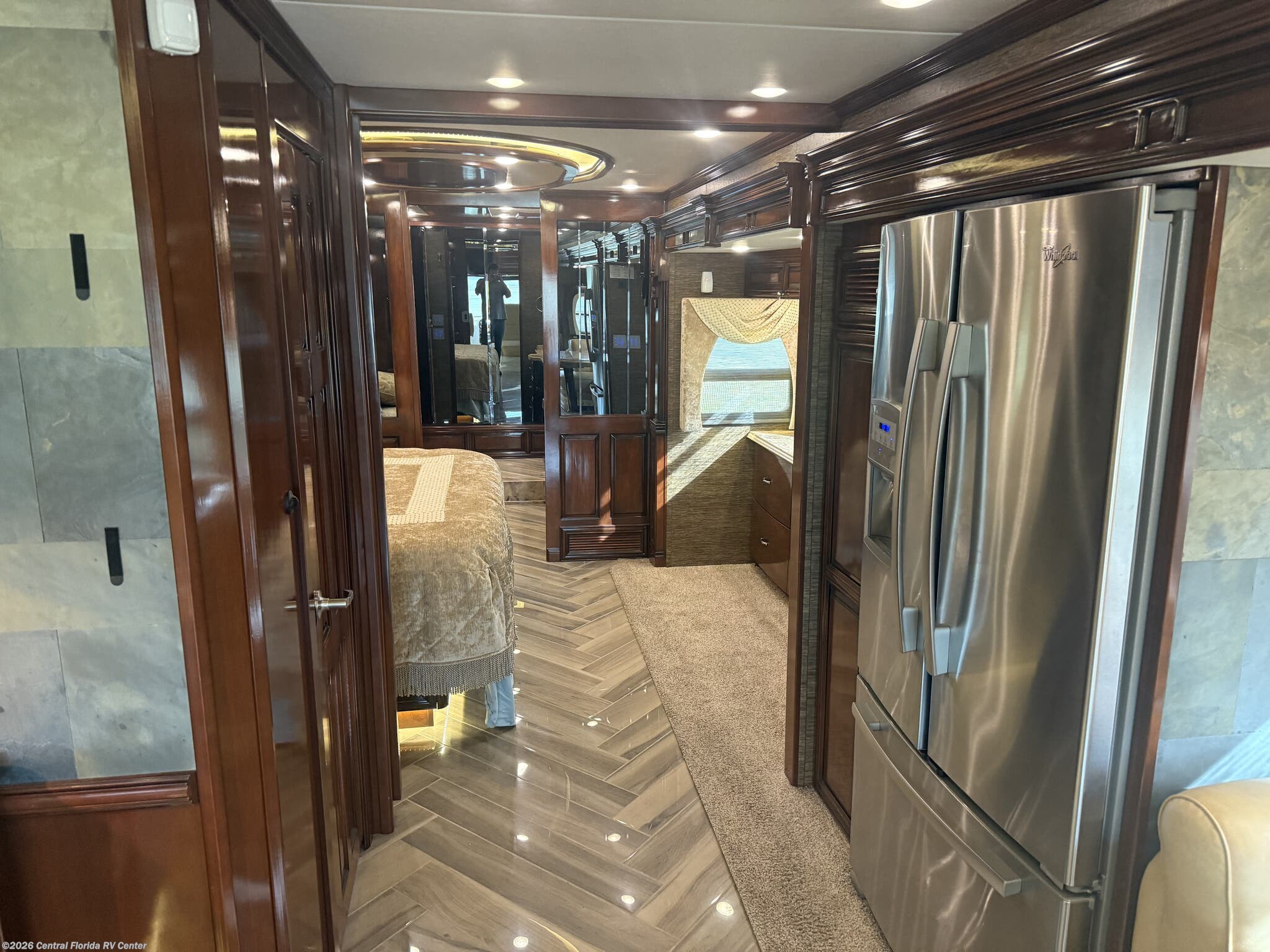 She looks stunning with her custom Poppy FBP, Dune interior, special order Ginger Glazed Maple Hi-Gloss Cabinets, stainless steel trim and Alcoa Dura-Brite aluminum wheels with Michelin tires that have less than 5,000 miles on them.
