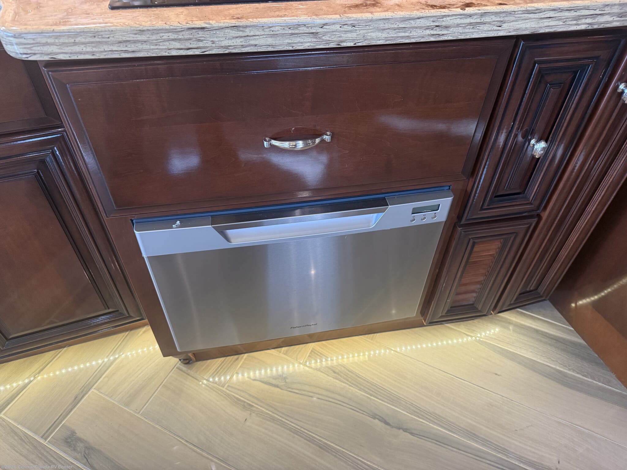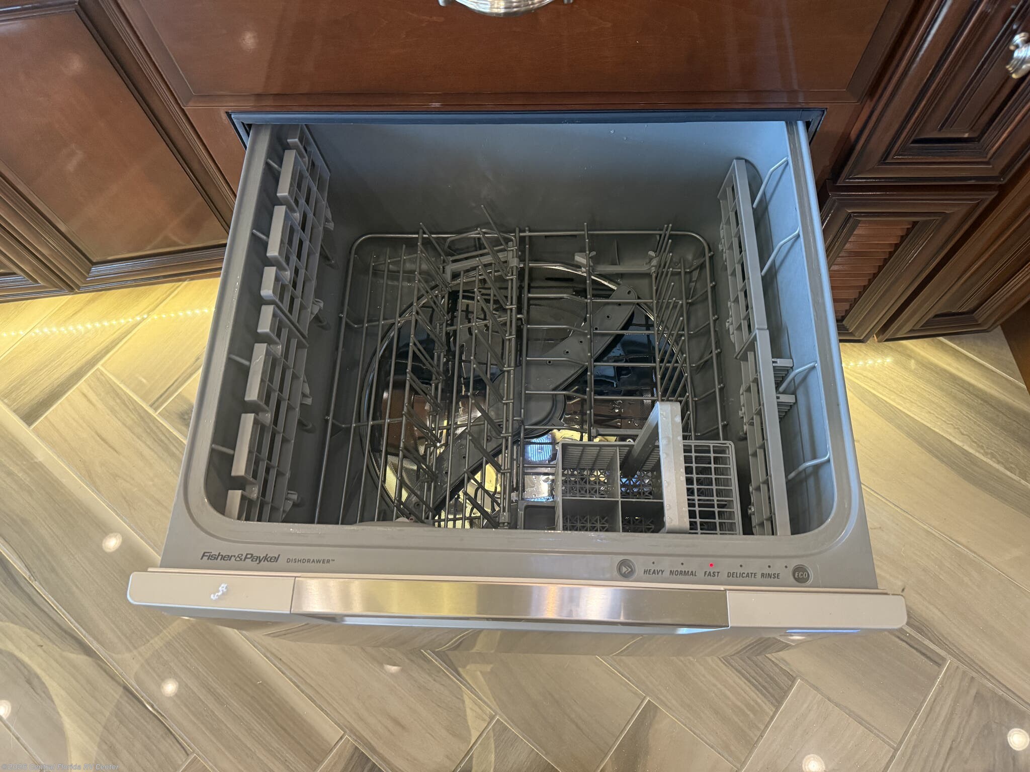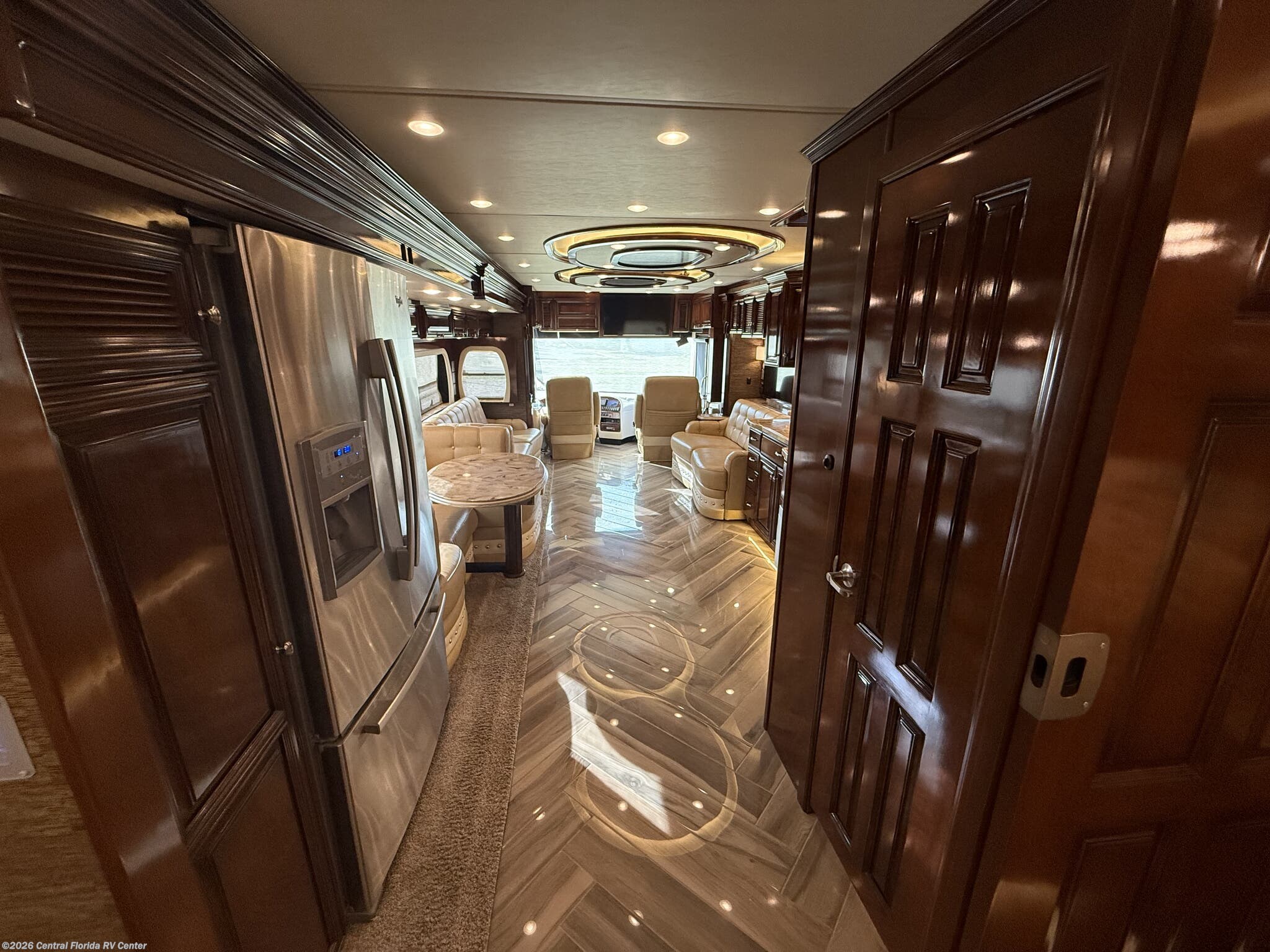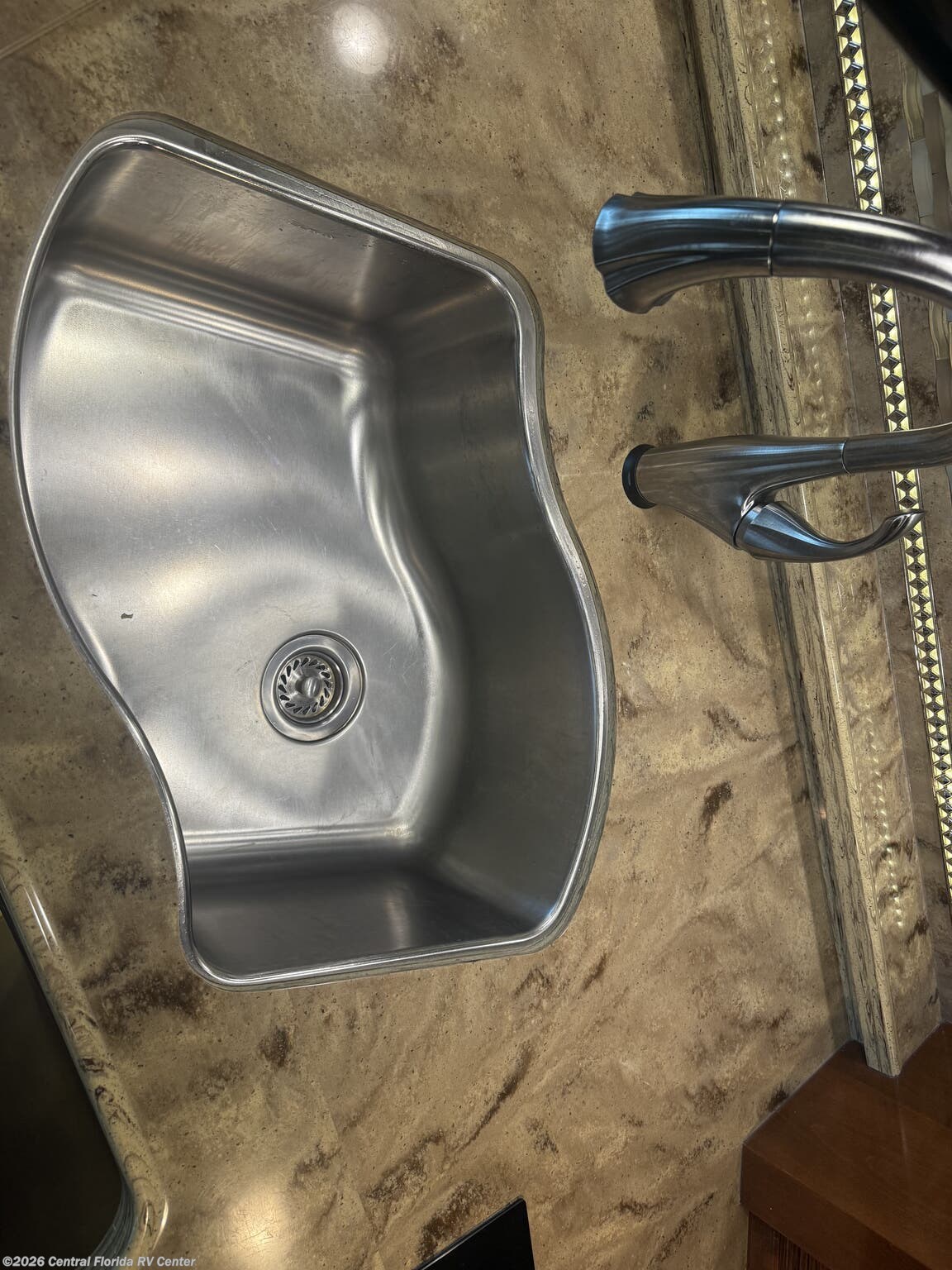 She looks stunning with her custom Poppy FBP, Dune interior, special order Ginger Glazed Maple Hi-Gloss Cabinets, stainless steel trim and Alcoa Dura-Brite aluminum wheels with Michelin tires that have less than 5,000 miles on them.
