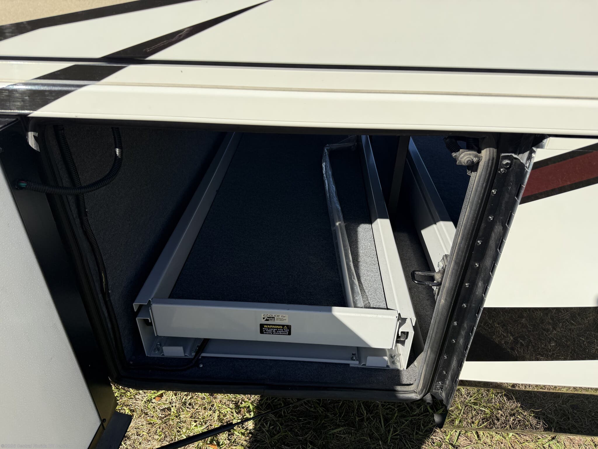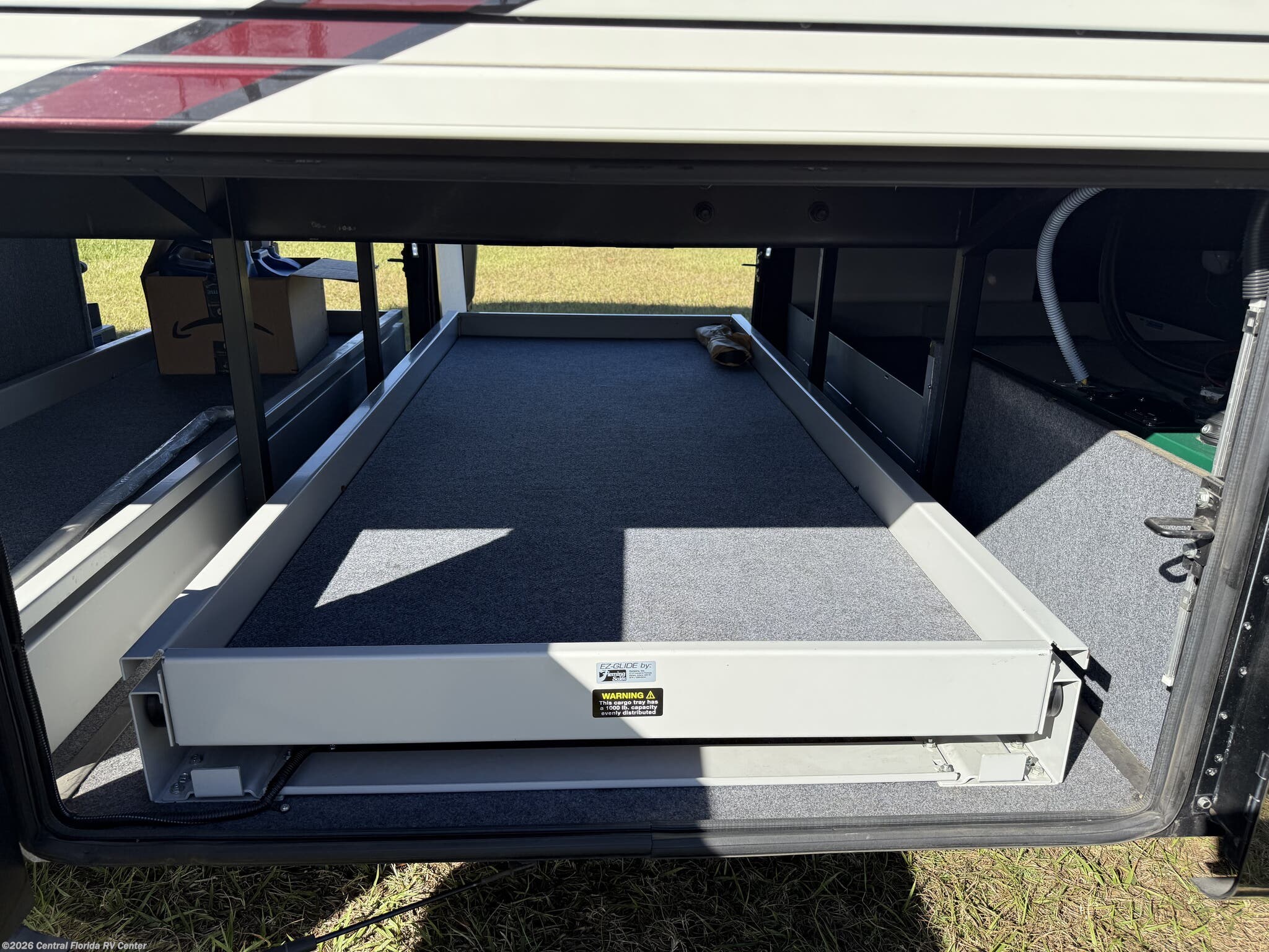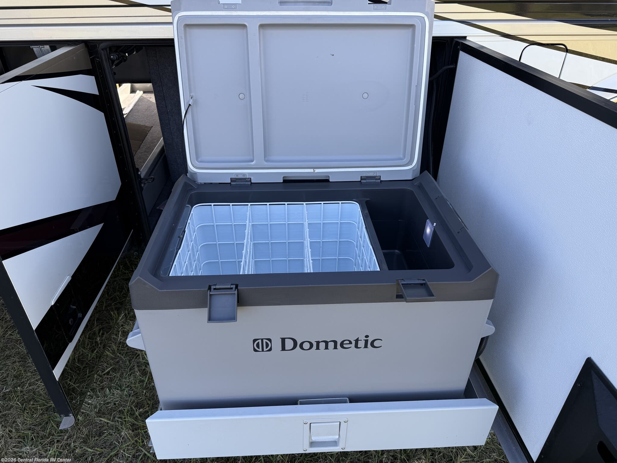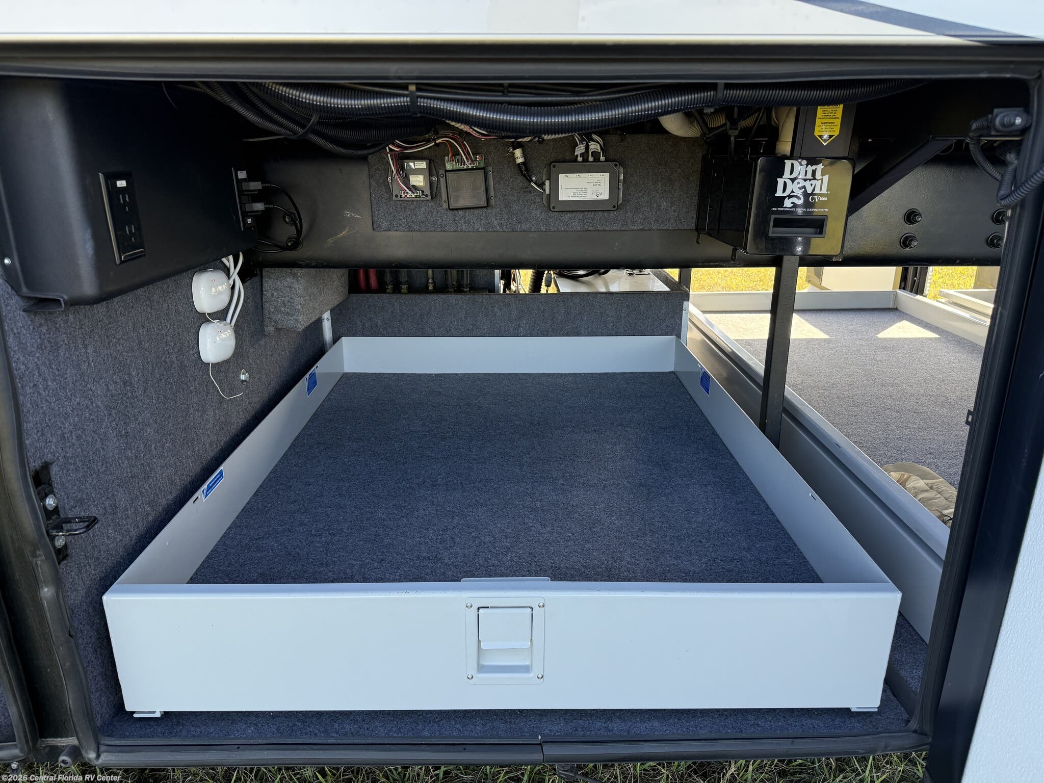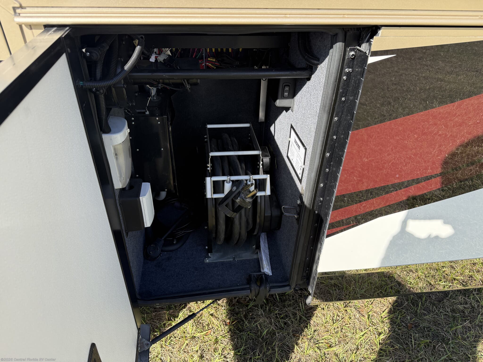 Exterior features include motorized entrance door, family room and master bedroom awnings and Girard NOVA power awnings with wind sensor & remote control. There are pass thru motorized storage trays (1 large and 1 small) (option), exterior LED accent lights, LED lights in exterior storage compartments w/automatic switches, LED side docking lights, a Dometic CF-110 Refrigerator/Freezer on pullout tray, and a water compartment with electric reel, shower hose, wash station.