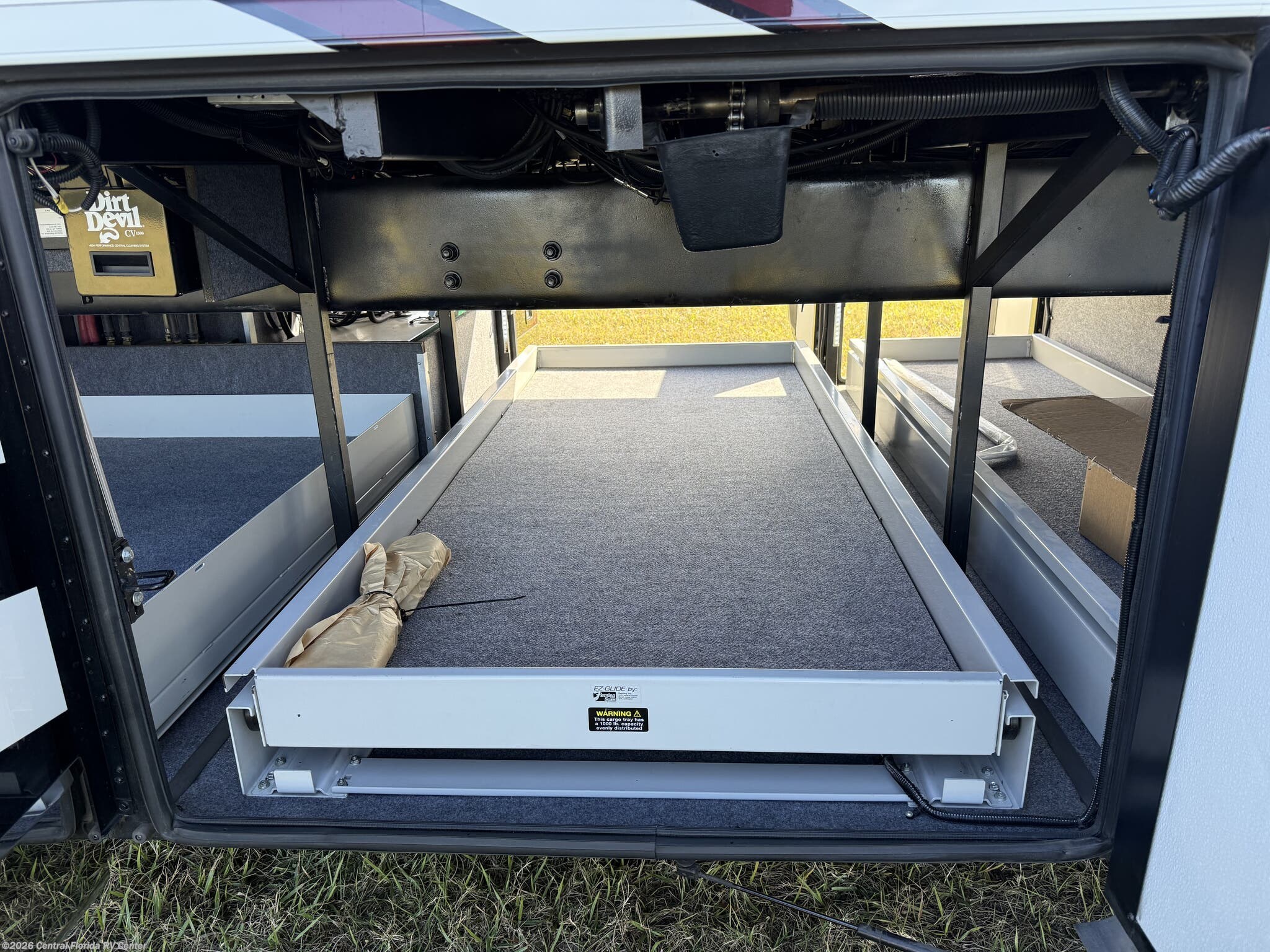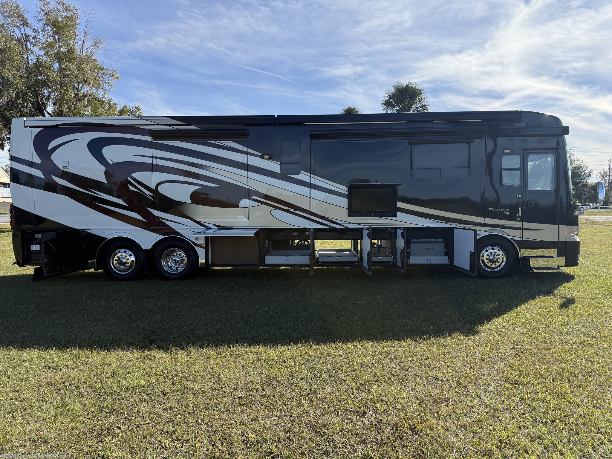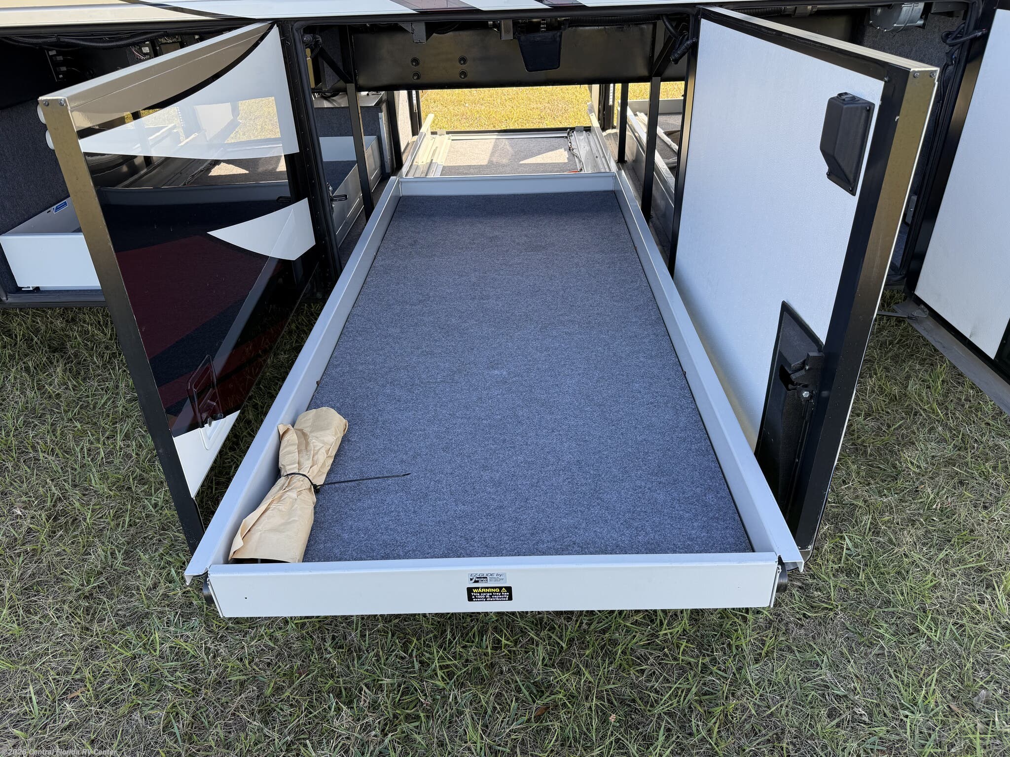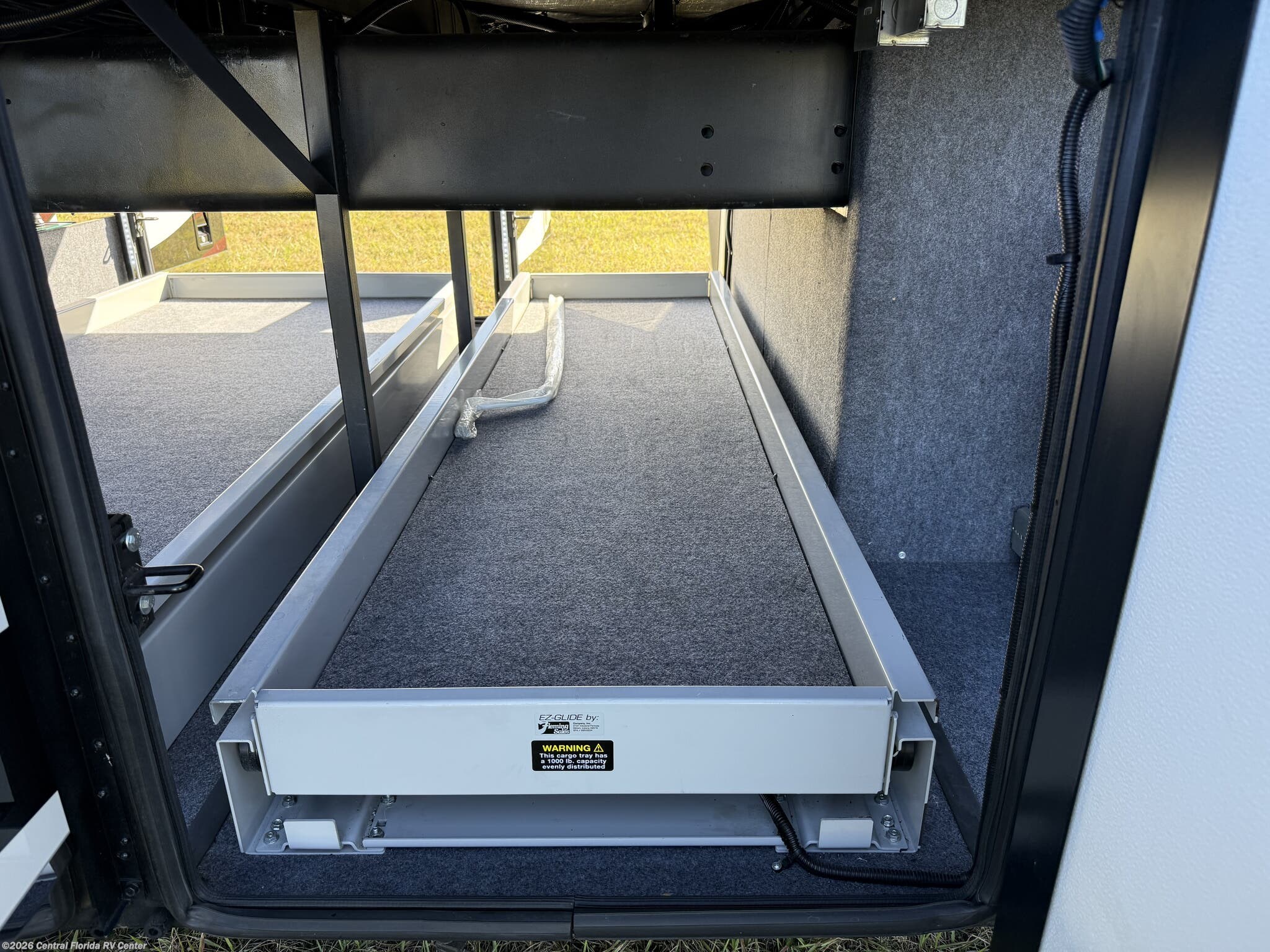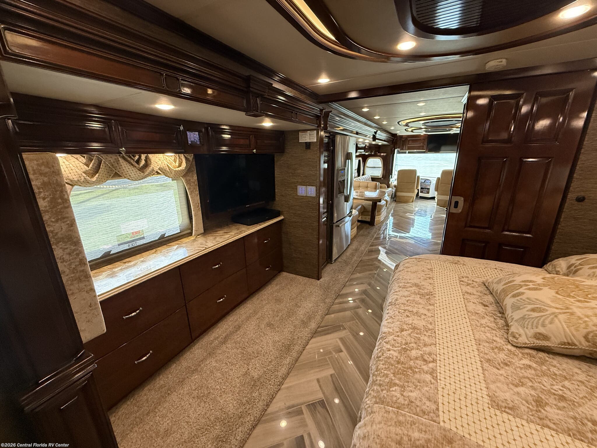 Exterior features include motorized entrance door, family room and master bedroom awnings and Girard NOVA power awnings with wind sensor & remote control. There are pass thru motorized storage trays (1 large and 1 small) (option), exterior LED accent lights, LED lights in exterior storage compartments w/automatic switches, LED side docking lights, a Dometic CF-110 Refrigerator/Freezer on pullout tray, and a water compartment with electric reel, shower hose, wash station.