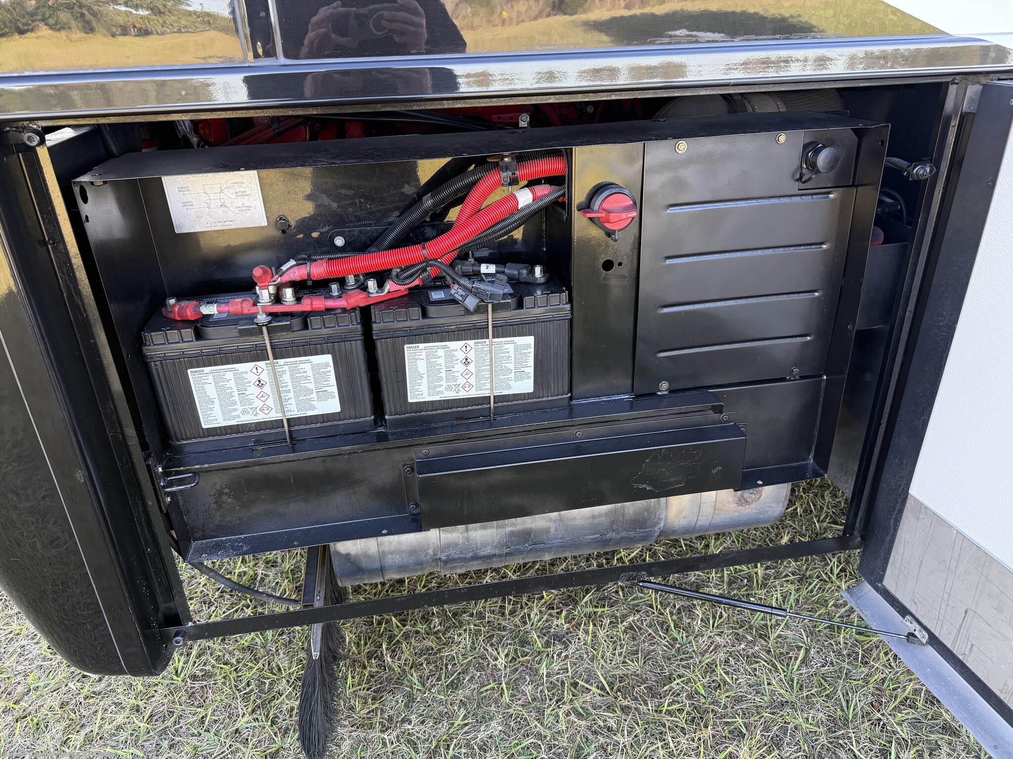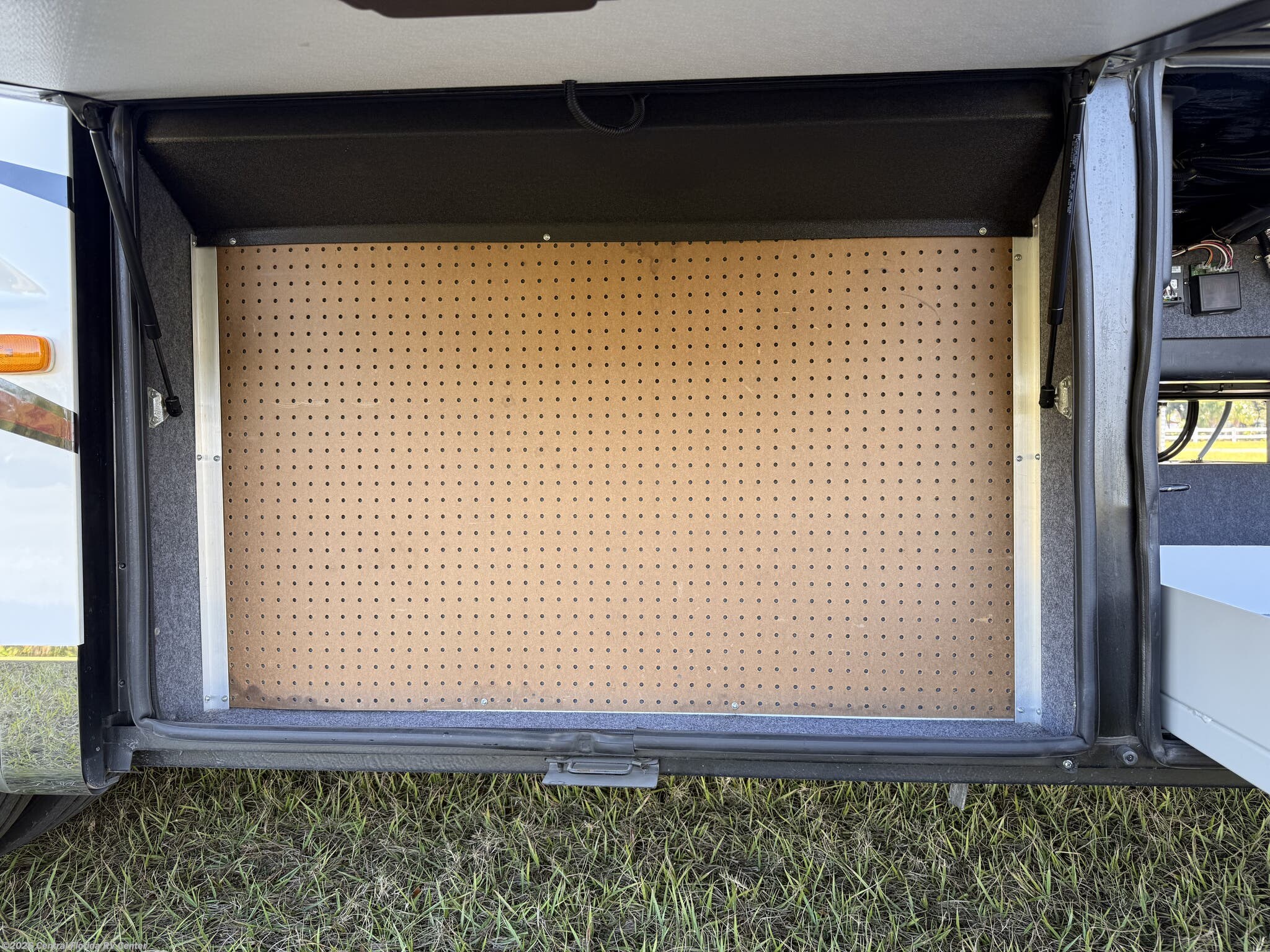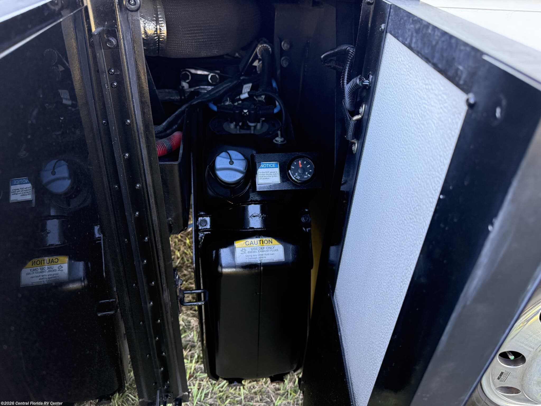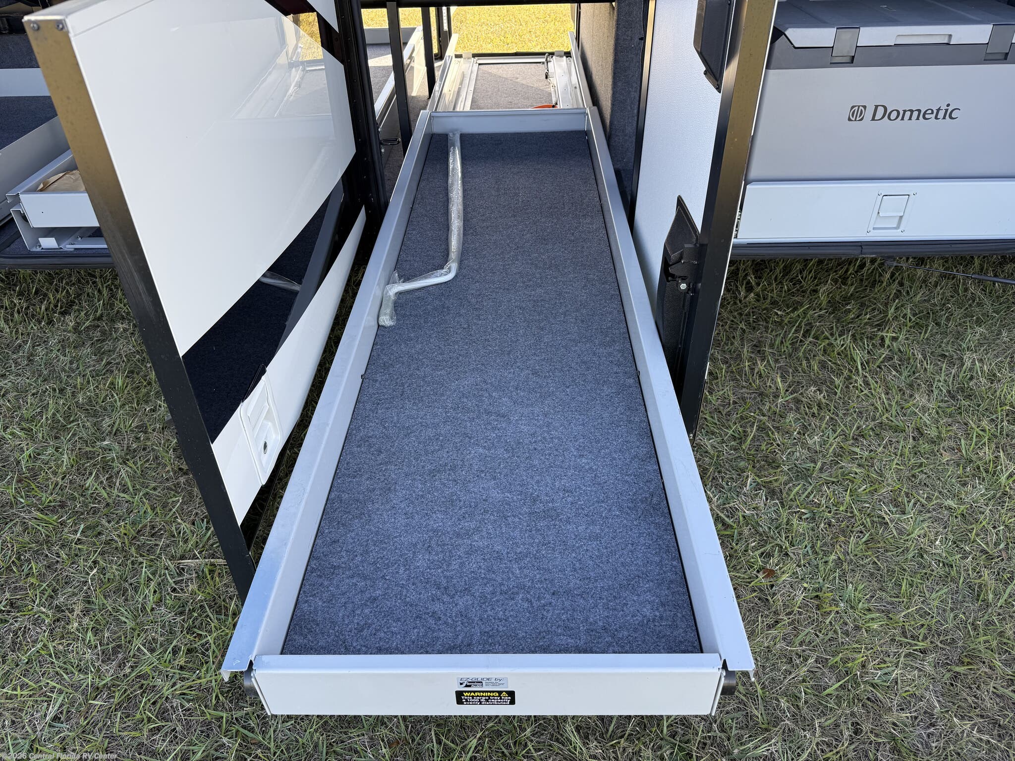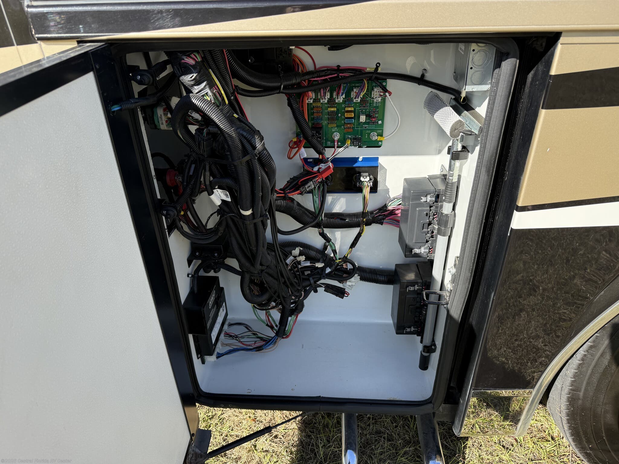 Exterior features include motorized entrance door, family room and master bedroom awnings and Girard NOVA power awnings with wind sensor & remote control. There are pass thru motorized storage trays (1 large and 1 small) (option), exterior LED accent lights, LED lights in exterior storage compartments w/automatic switches, LED side docking lights, a Dometic CF-110 Refrigerator/Freezer on pullout tray, and a water compartment with electric reel, shower hose, wash station.