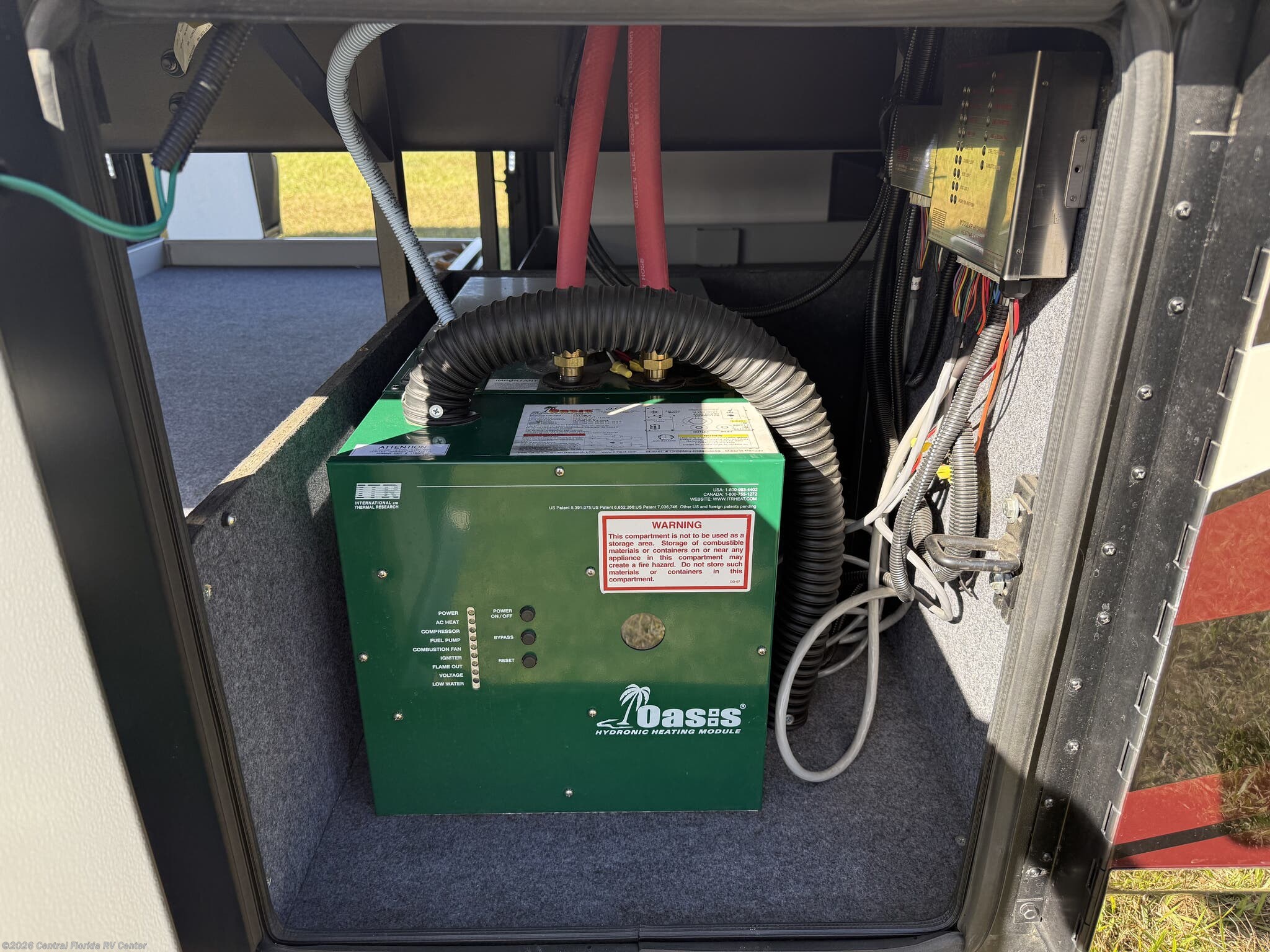 The coach is cooled by 3 15K BTU Penguin A/Cs w/ Heat pumps and is heated by a Hydronic (Oasis) Zone Diesel heating system. Mechanicals include a 12.5 KW Onan diesel generator on hydraulic slide tray, a 50 amp service and Eight 6 volt house batteries on pullout tray.
