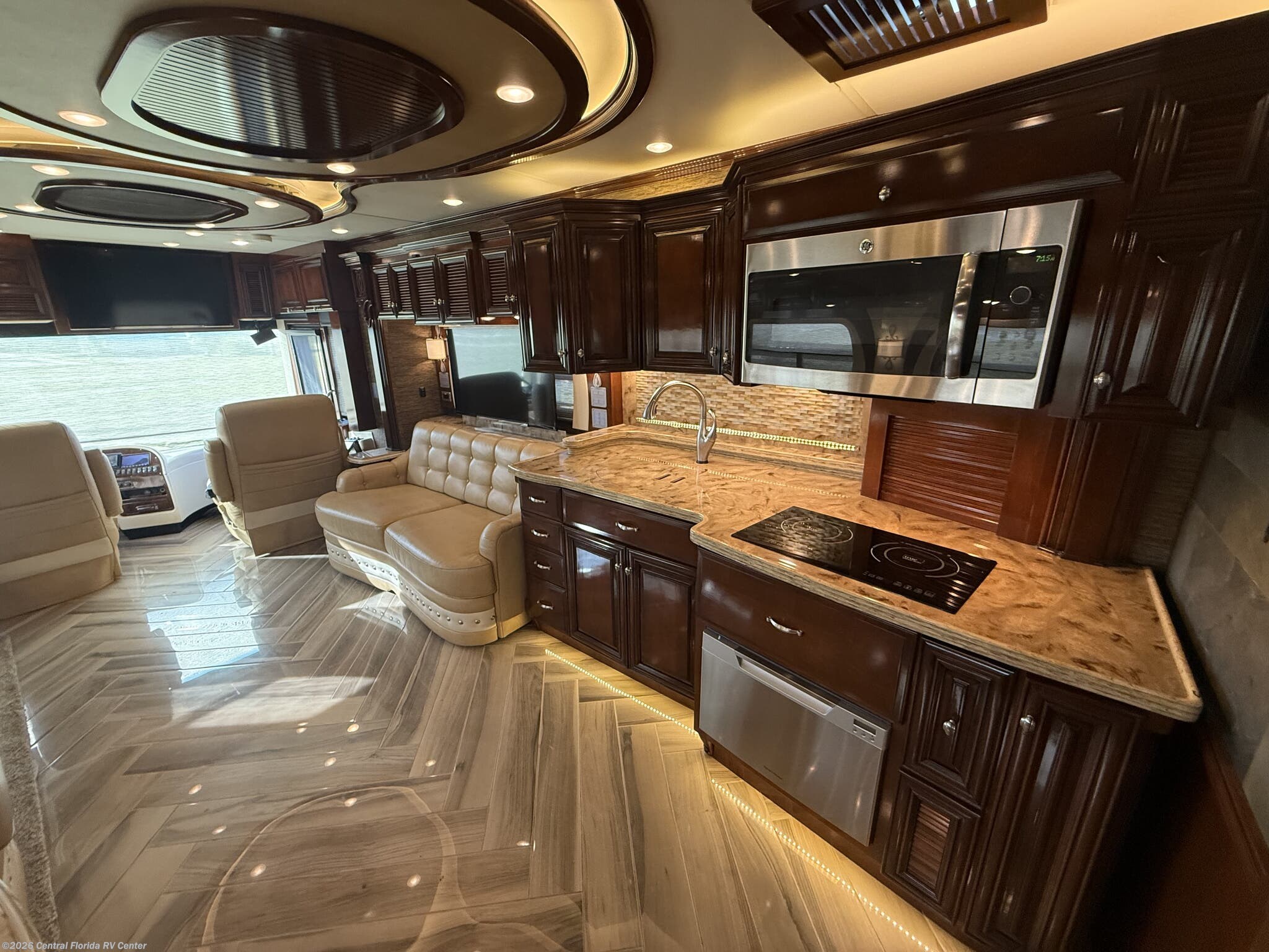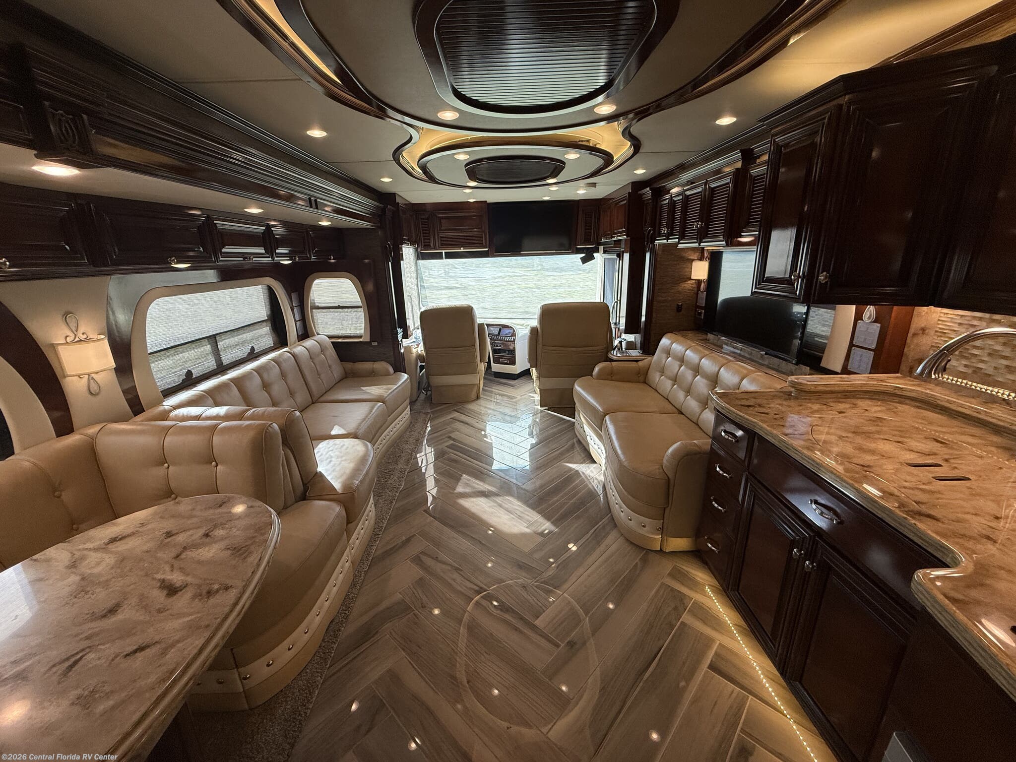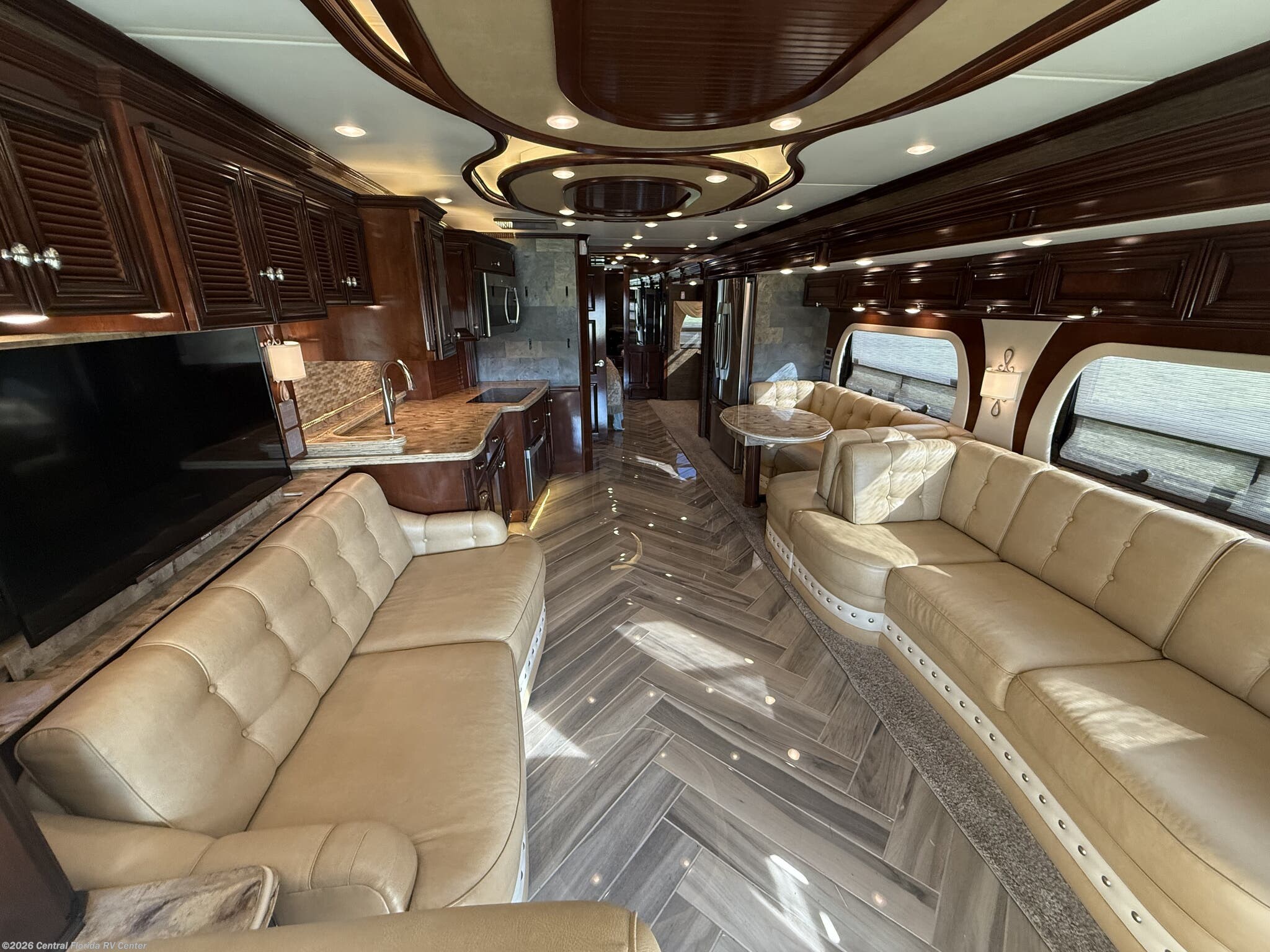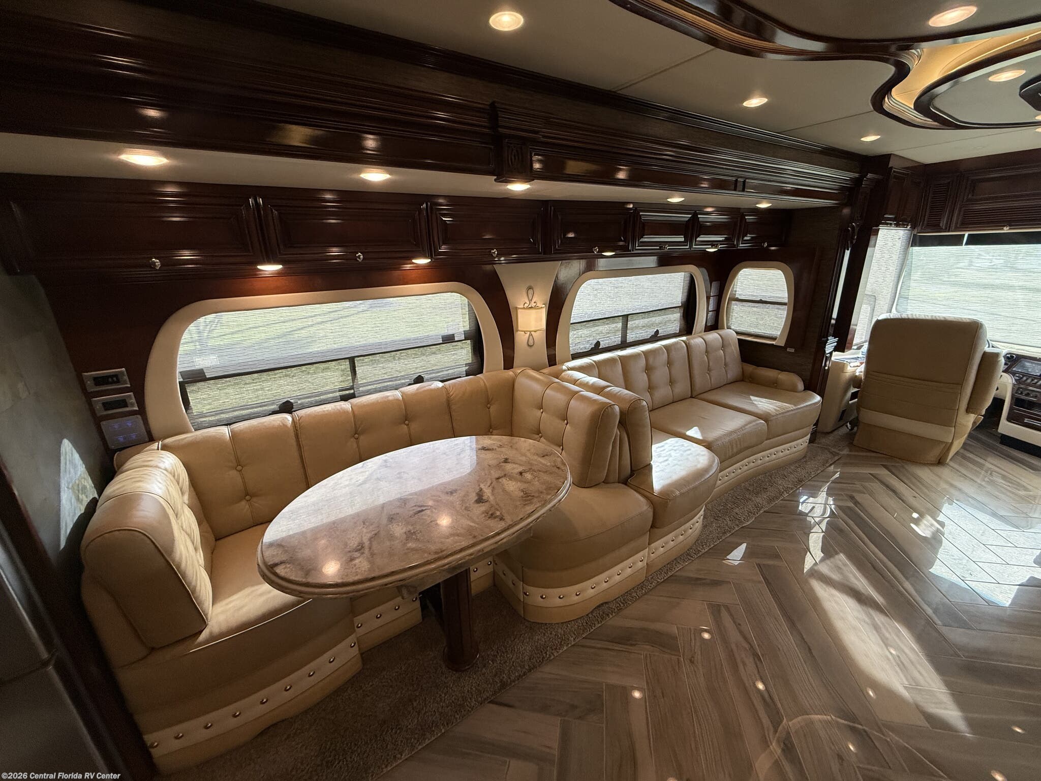 Inside the coach you will find LED recessed lights in the ceiling and overhead cabinets, heated 3 zone polished custom porcelain floor tile (options), polished solid countertops, 48” Sony LED TV w/Blu-Ray player in living area on Televator w/surround sound, leather sofa with full size air mattress, 2 leather wall hugger recliners with lamp stand cabinet, Euro booth dinette seating w/overhead cabinets in dinette and recliner areas (option) and auto motion power silhouette window shades.