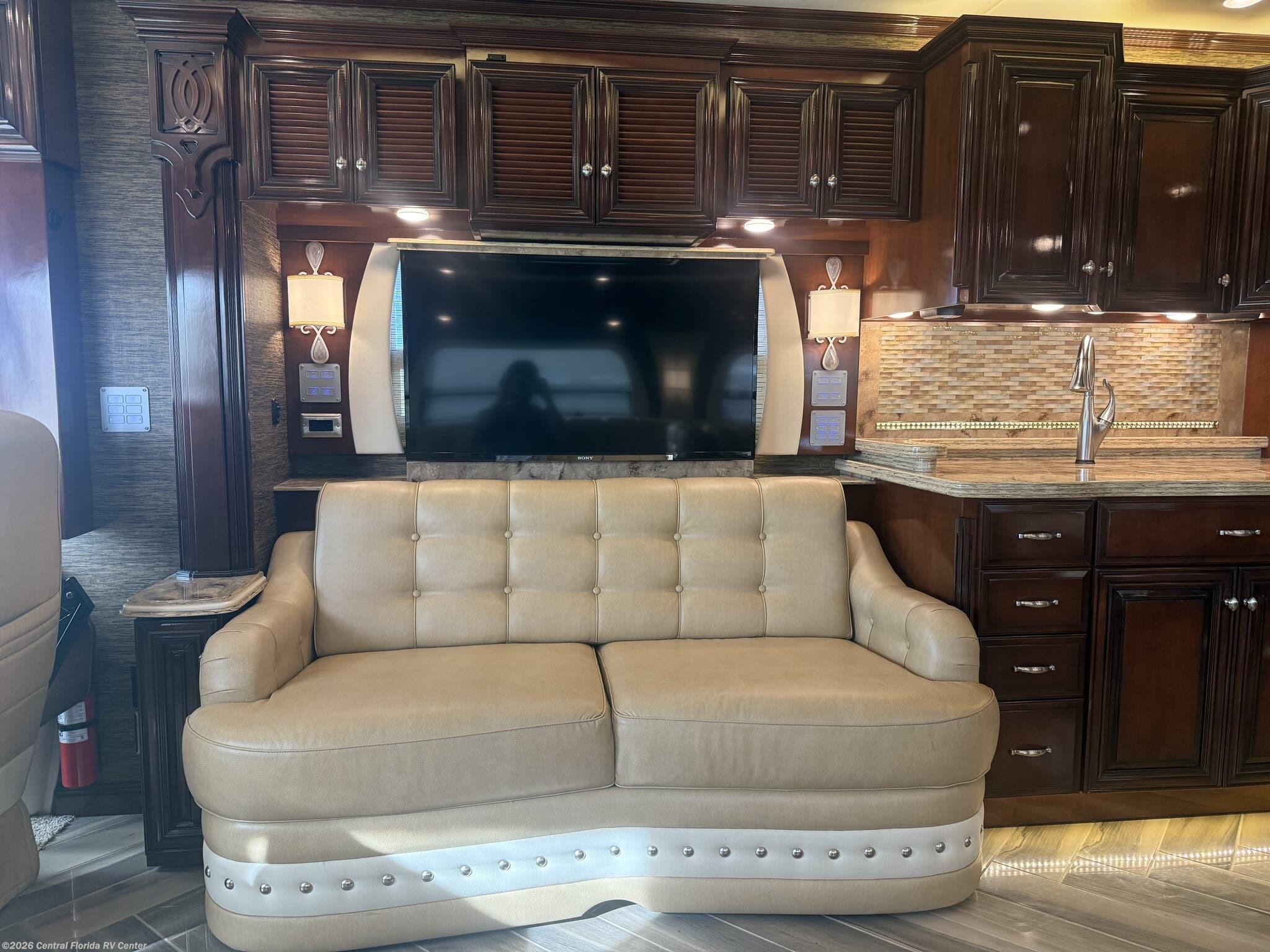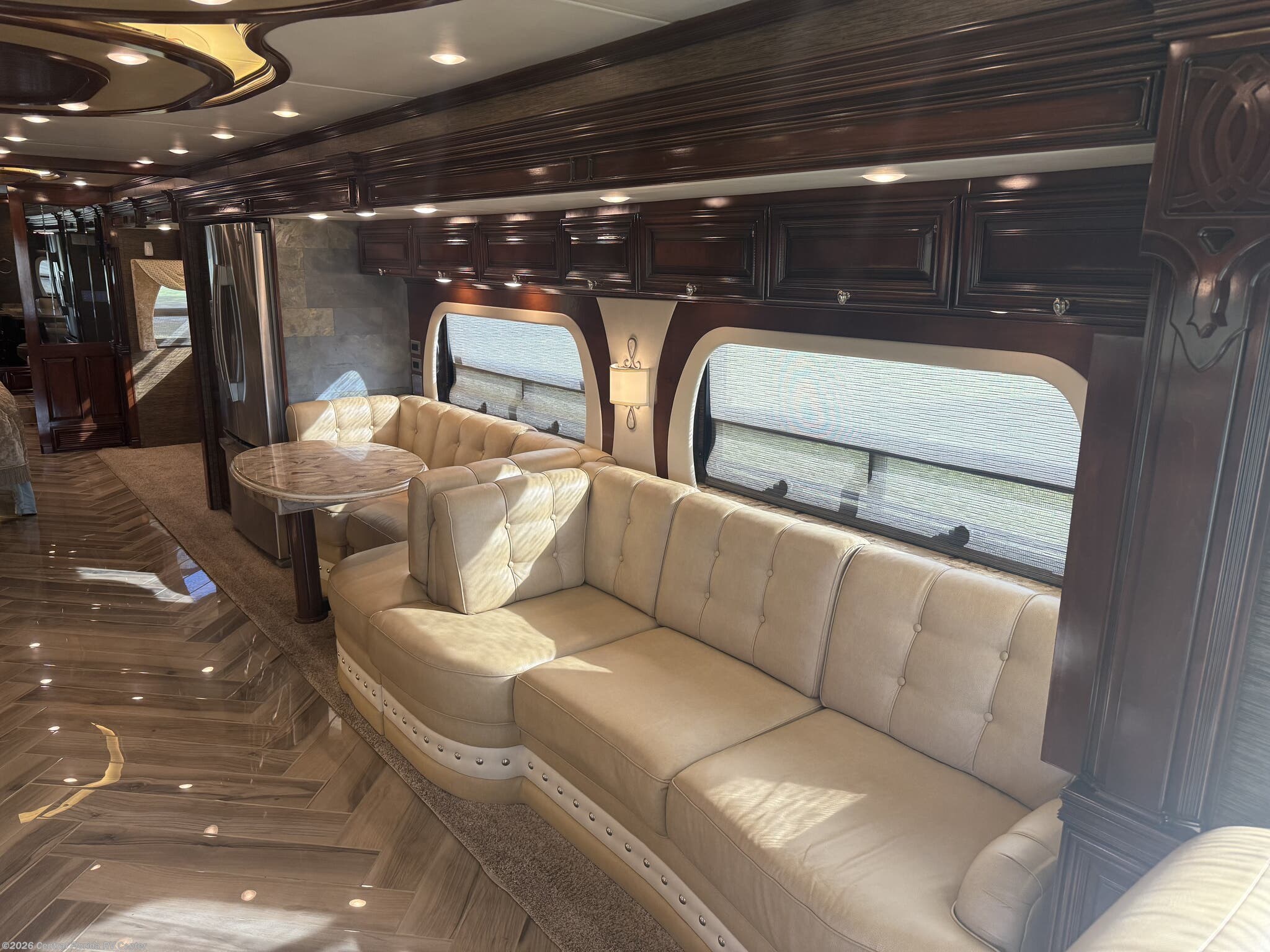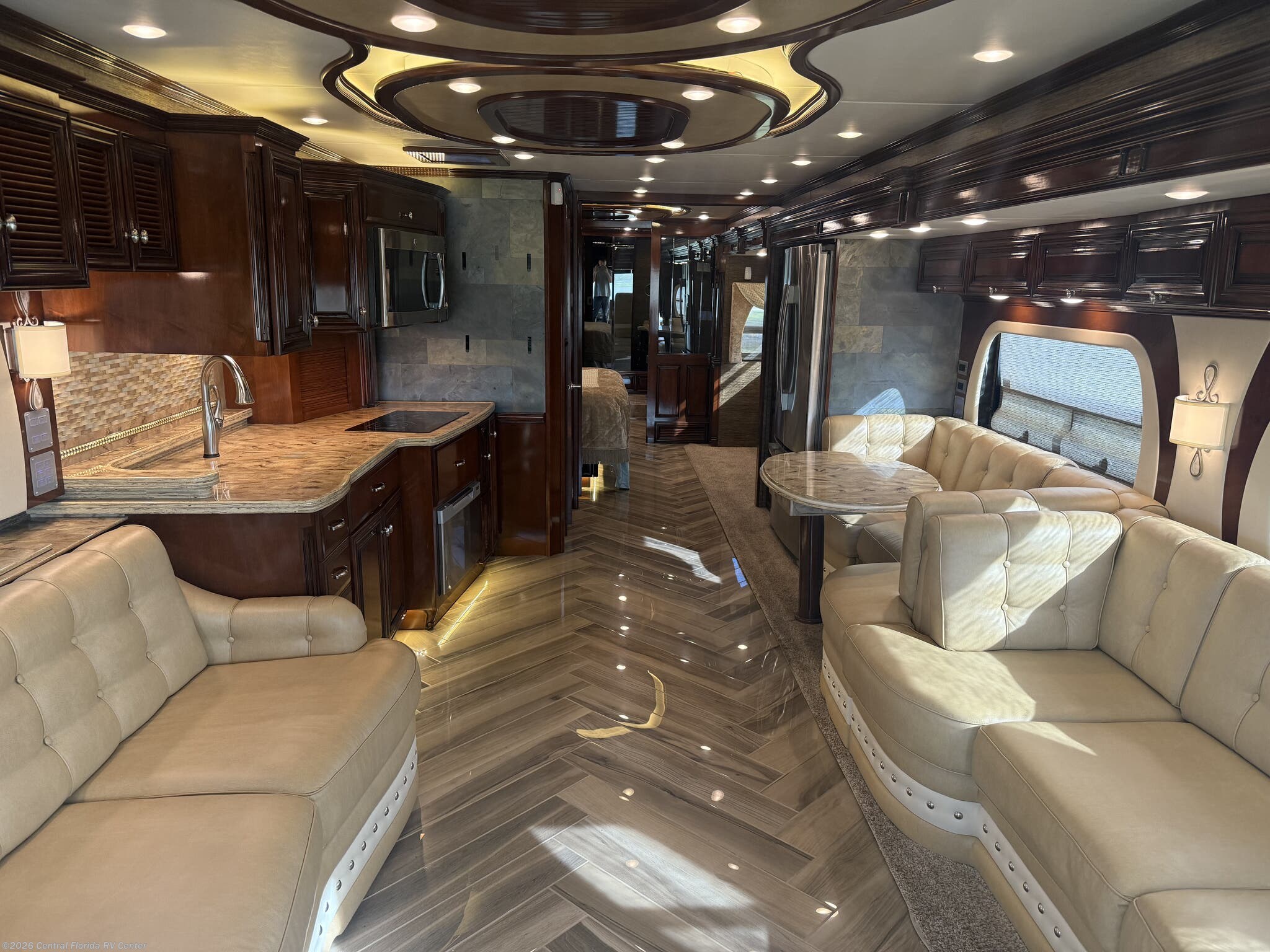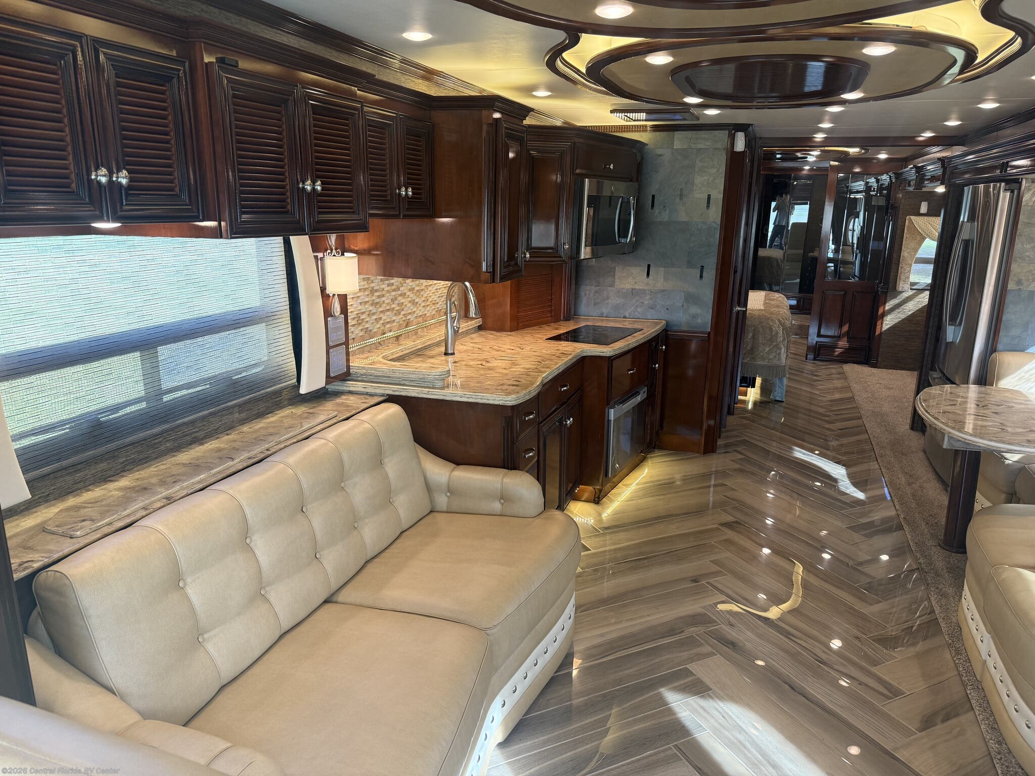 Inside the coach you will find LED recessed lights in the ceiling and overhead cabinets, heated 3 zone polished custom porcelain floor tile (options), polished solid countertops, 48” Sony LED TV w/Blu-Ray player in living area on Televator w/surround sound, leather sofa with full size air mattress, 2 leather wall hugger recliners with lamp stand cabinet, Euro booth dinette seating w/overhead cabinets in dinette and recliner areas (option) and auto motion power silhouette window shades.
