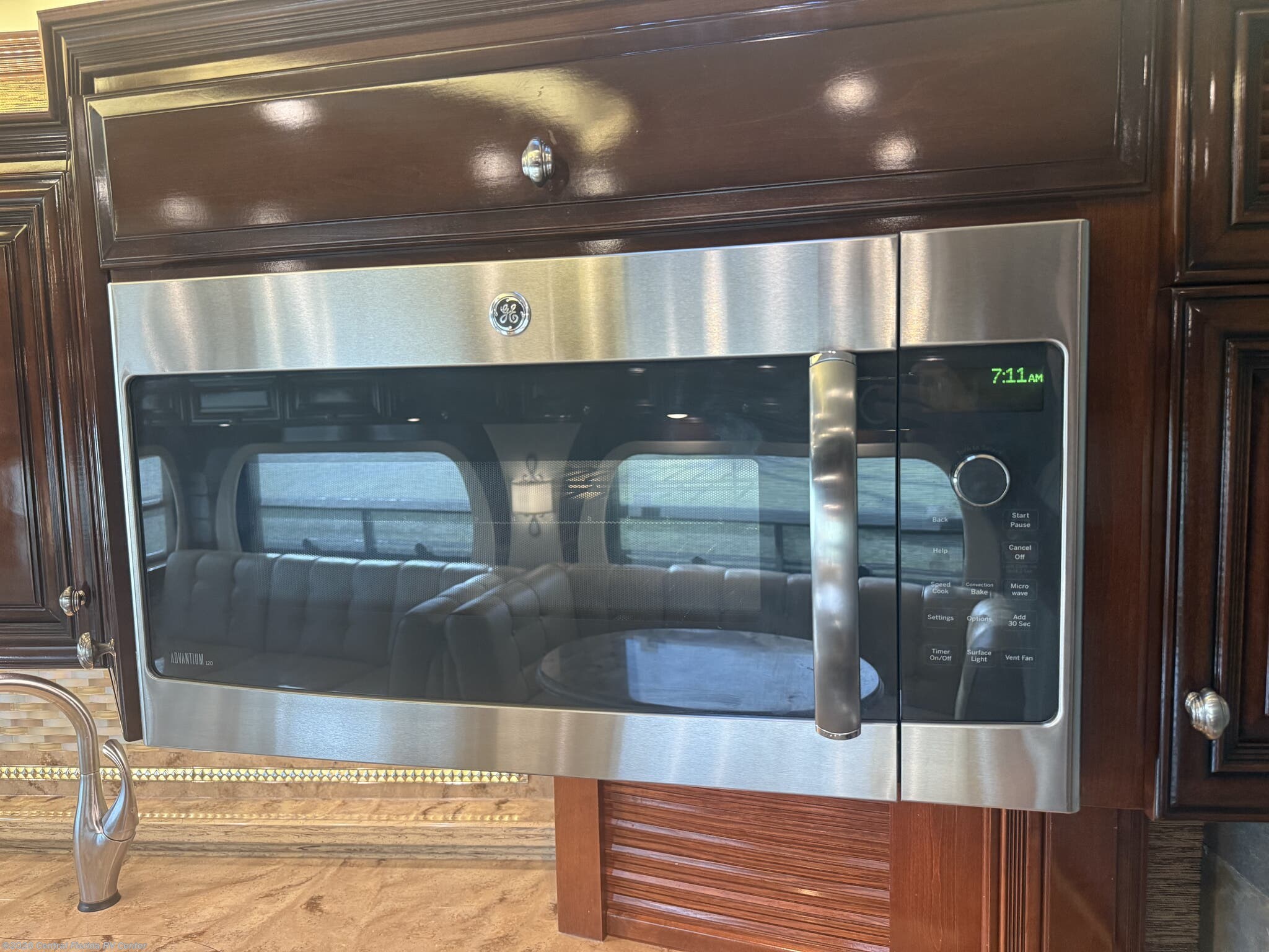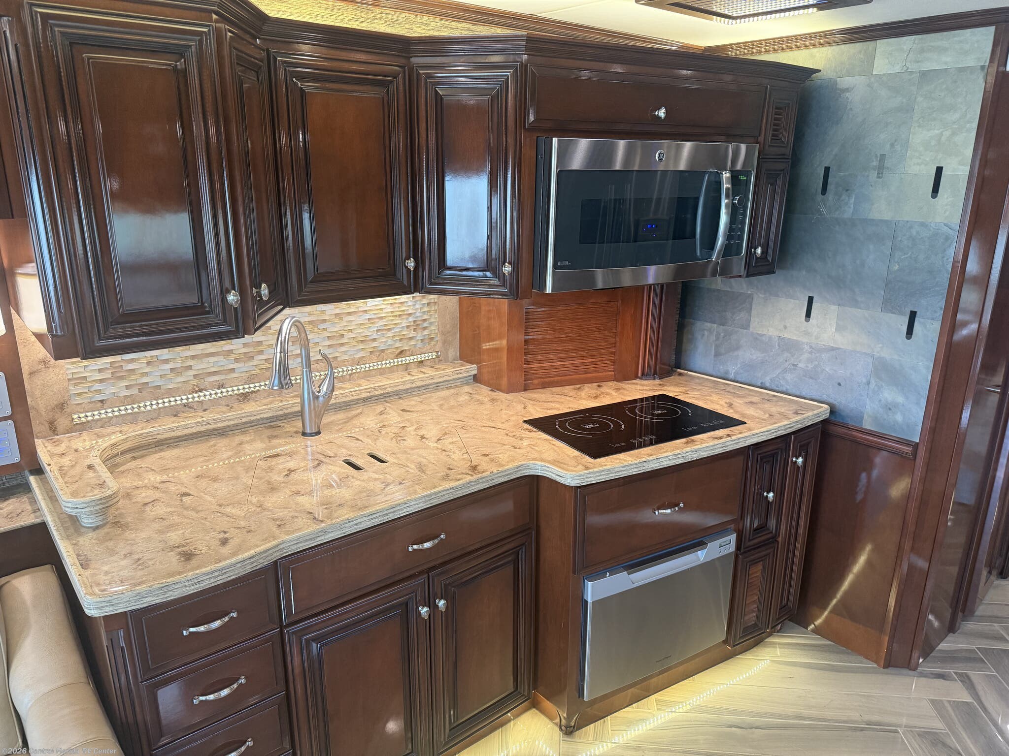 The galley area has an all-electric Kenyon ceramic glass 2 element cooktop (option), GE Advantium Microwave Oven 30” (option), Fisher & Paykel Drawer dishwasher (option), Whirlpool residential refrigerator/freezer with ice maker/water dispenser, central vacuum with tool kit (option), double stainless Steel kitchen sink with covers, touch control faucet and a kitchen window (option).