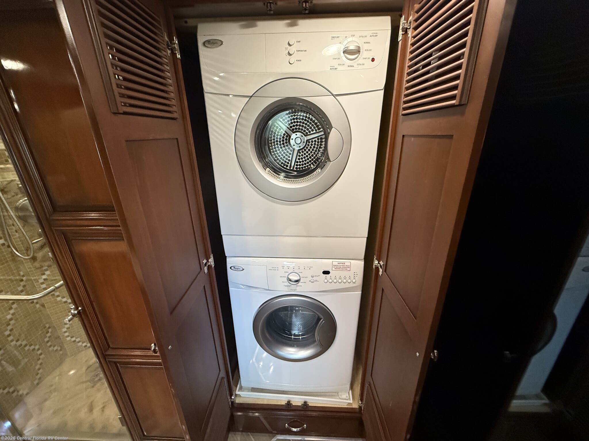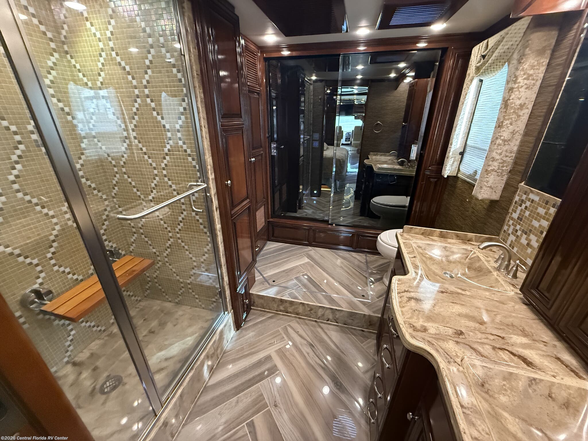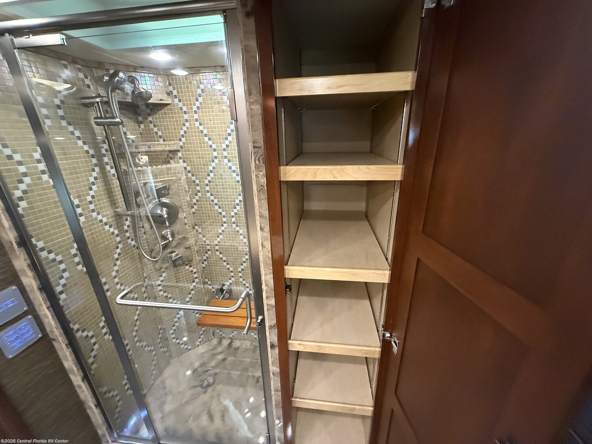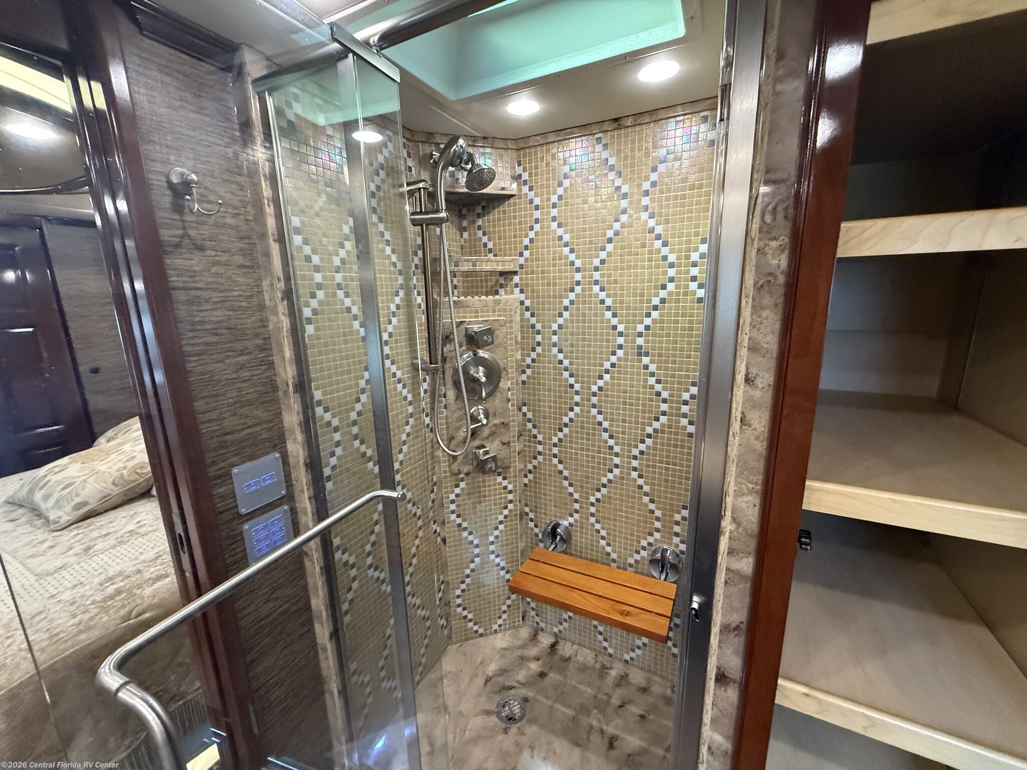 Once you enter the bedroom you will find a Sleep Number Premier King Air mattress, cedar paneling in rear closet, which also houses a safe, and the Whirlpool stacked washer and dryer. The bathroom has polished solid surface shower walls with full Mosaic tile walls, 3 shower heads, a handheld head and a fold down shower seat (option). The coach also has a whole house water filter system. There are ceiling vent fans in kitchen and bathrooms with rain sensors.