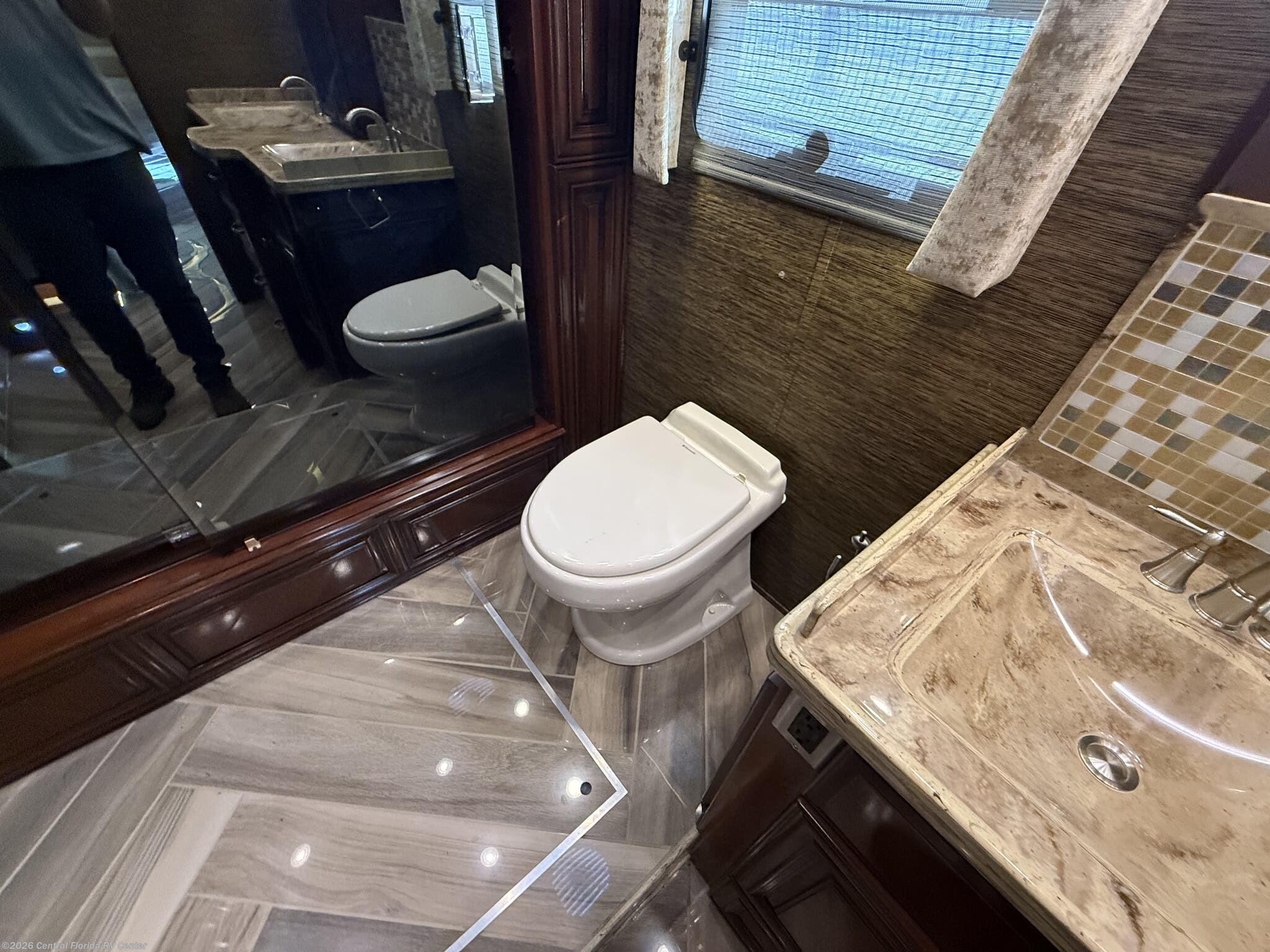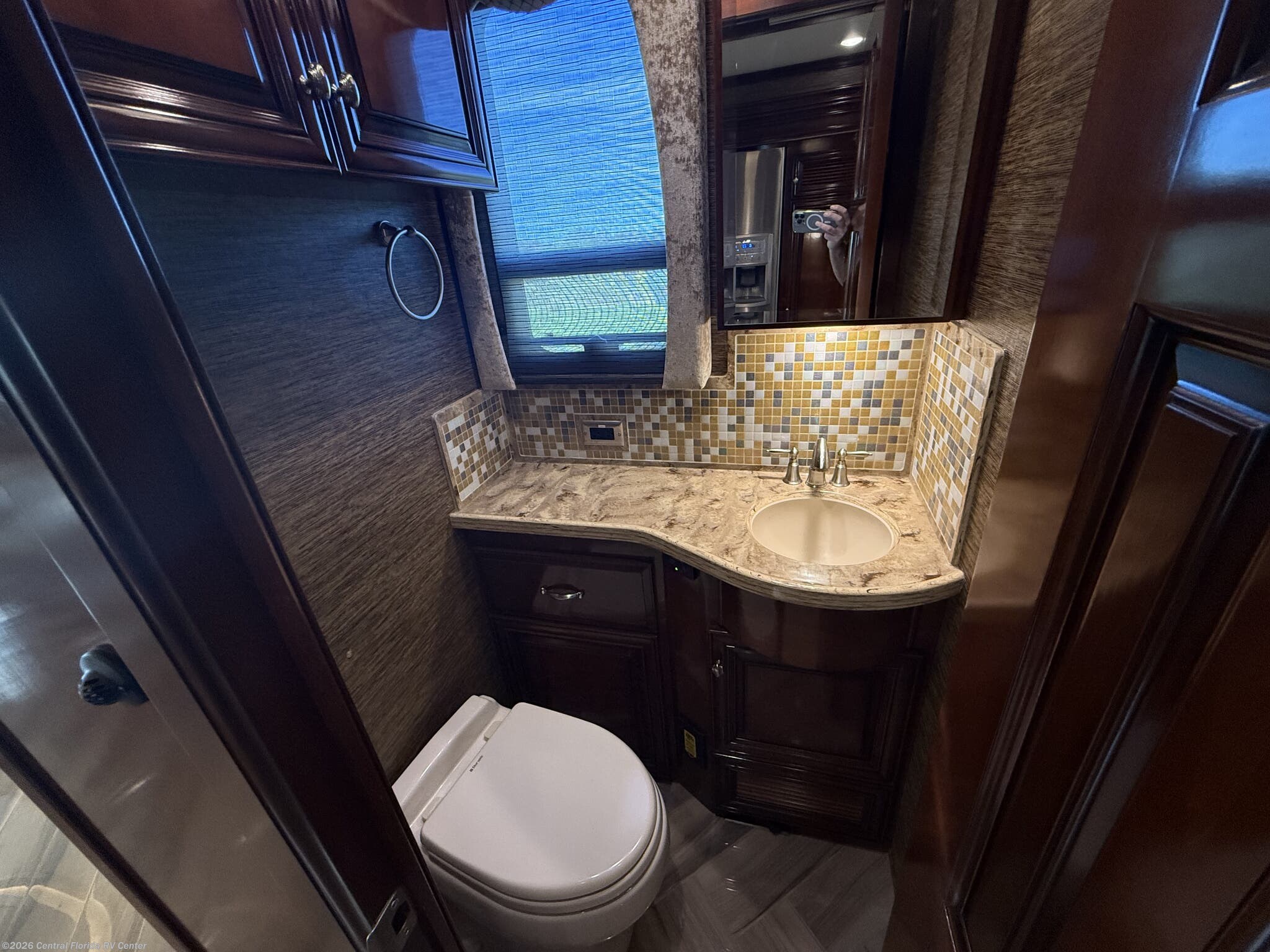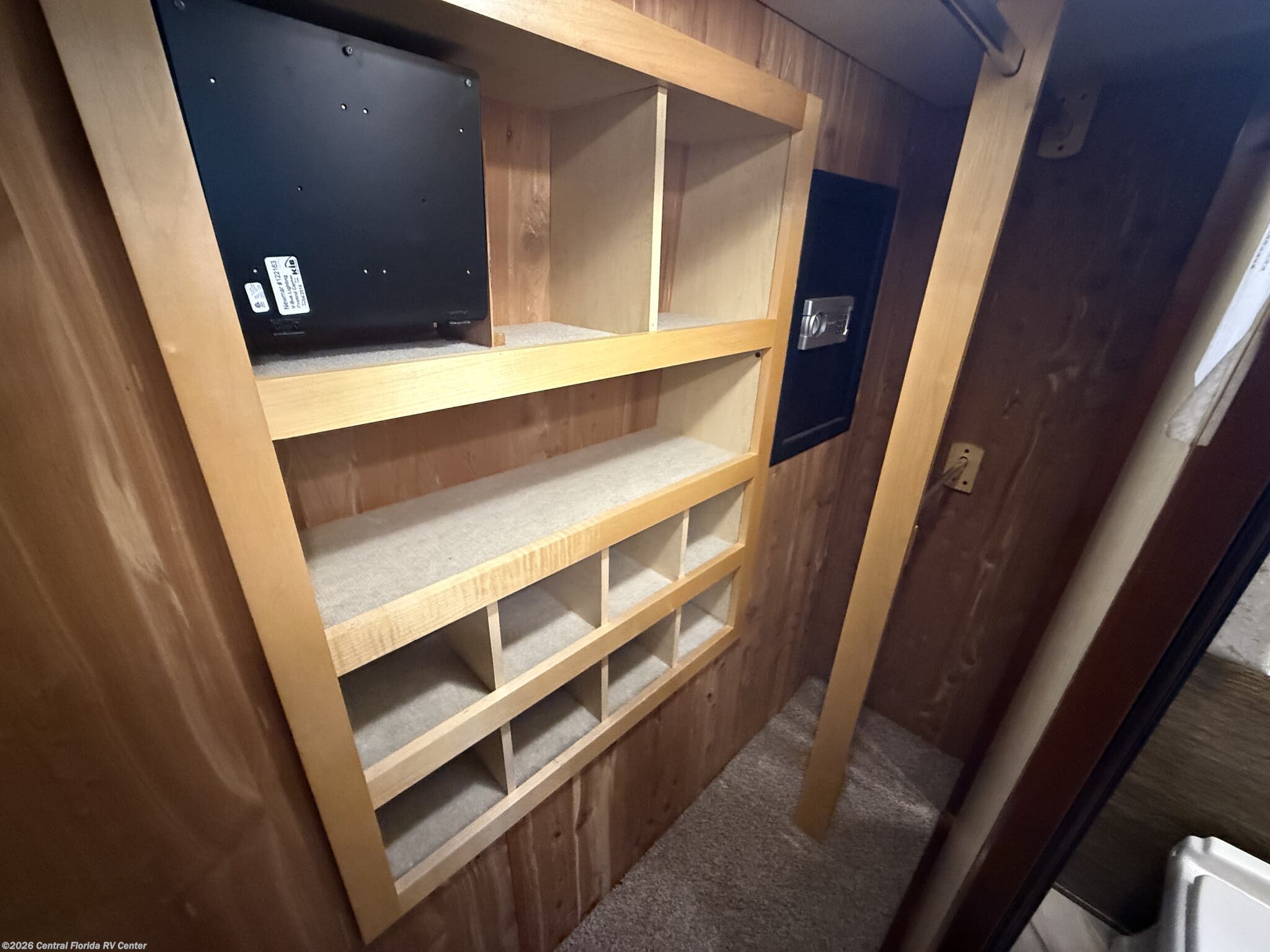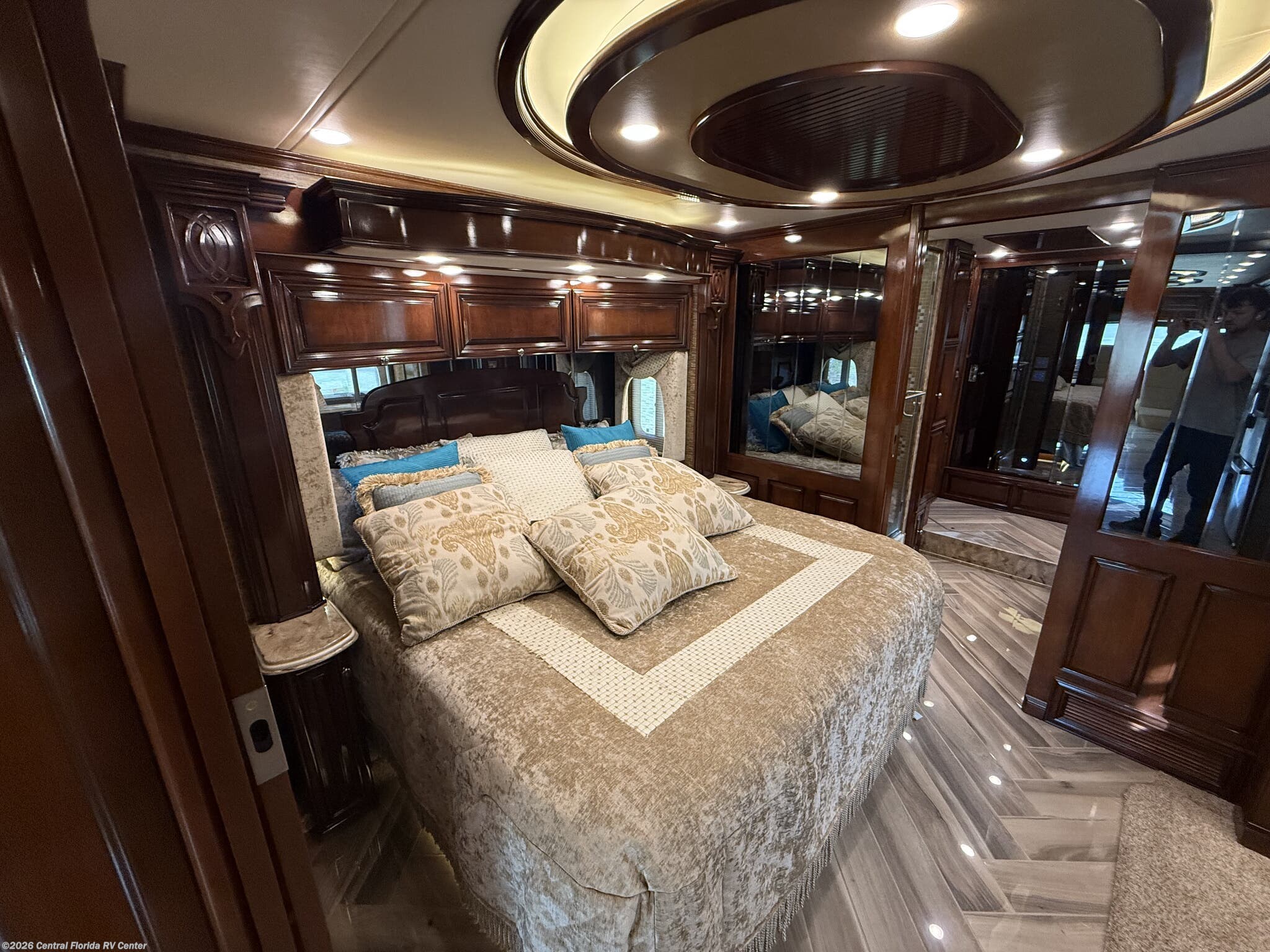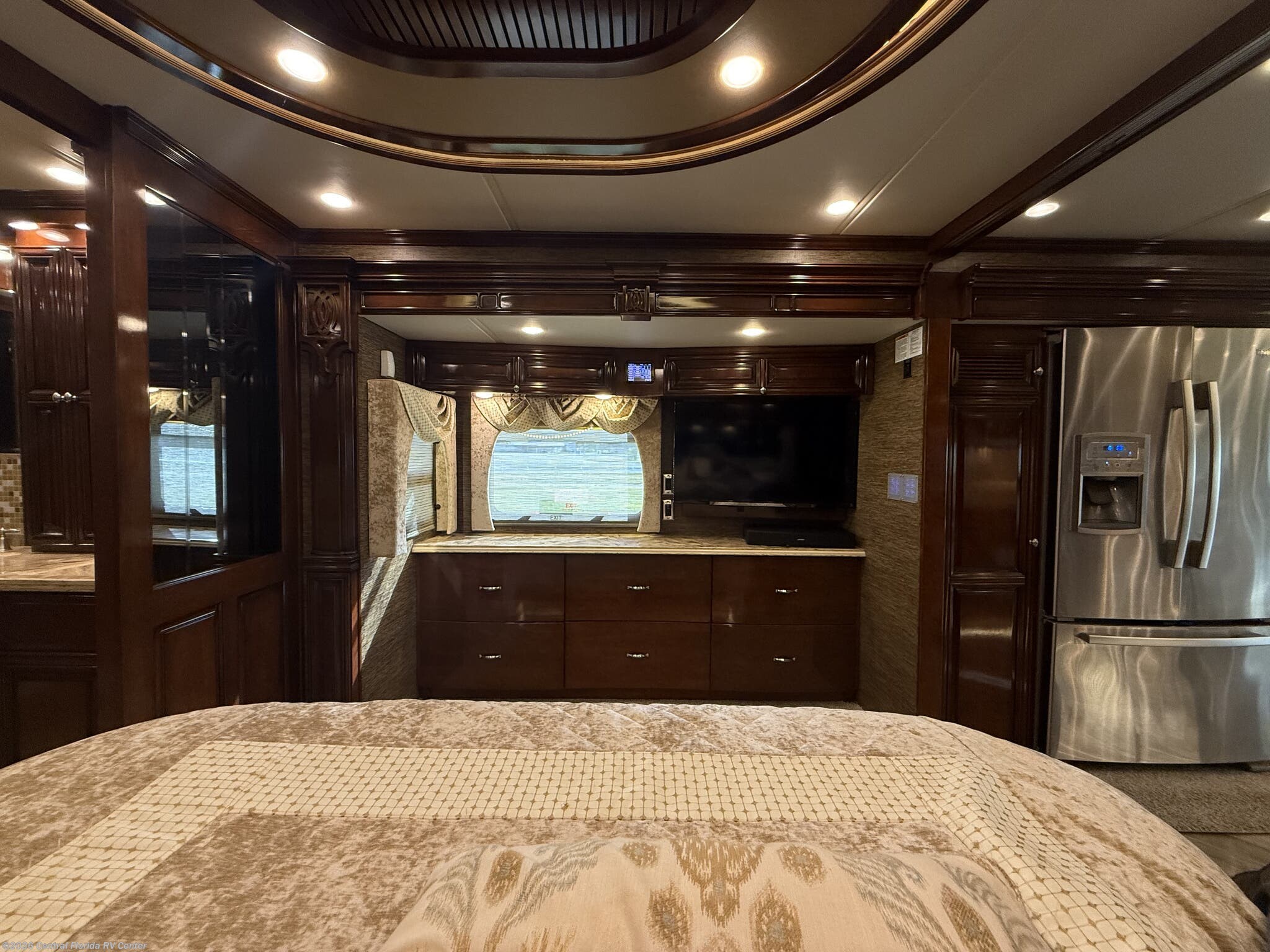 Once you enter the bedroom you will find a Sleep Number Premier King Air mattress, cedar paneling in rear closet, which also houses a safe, and the Whirlpool stacked washer and dryer. The bathroom has polished solid surface shower walls with full Mosaic tile walls, 3 shower heads, a handheld head and a fold down shower seat (option). The coach also has a whole house water filter system. There are ceiling vent fans in kitchen and bathrooms with rain sensors.