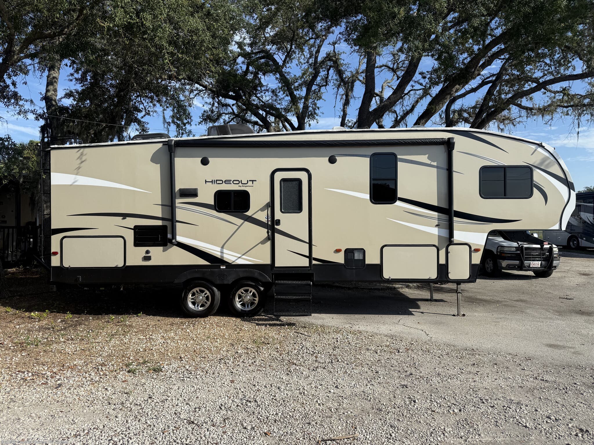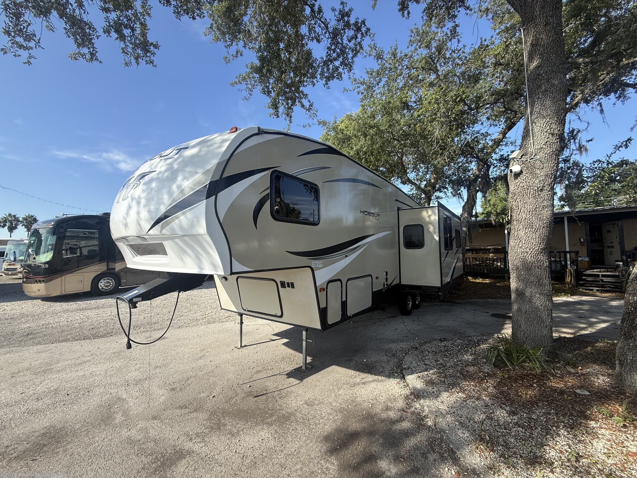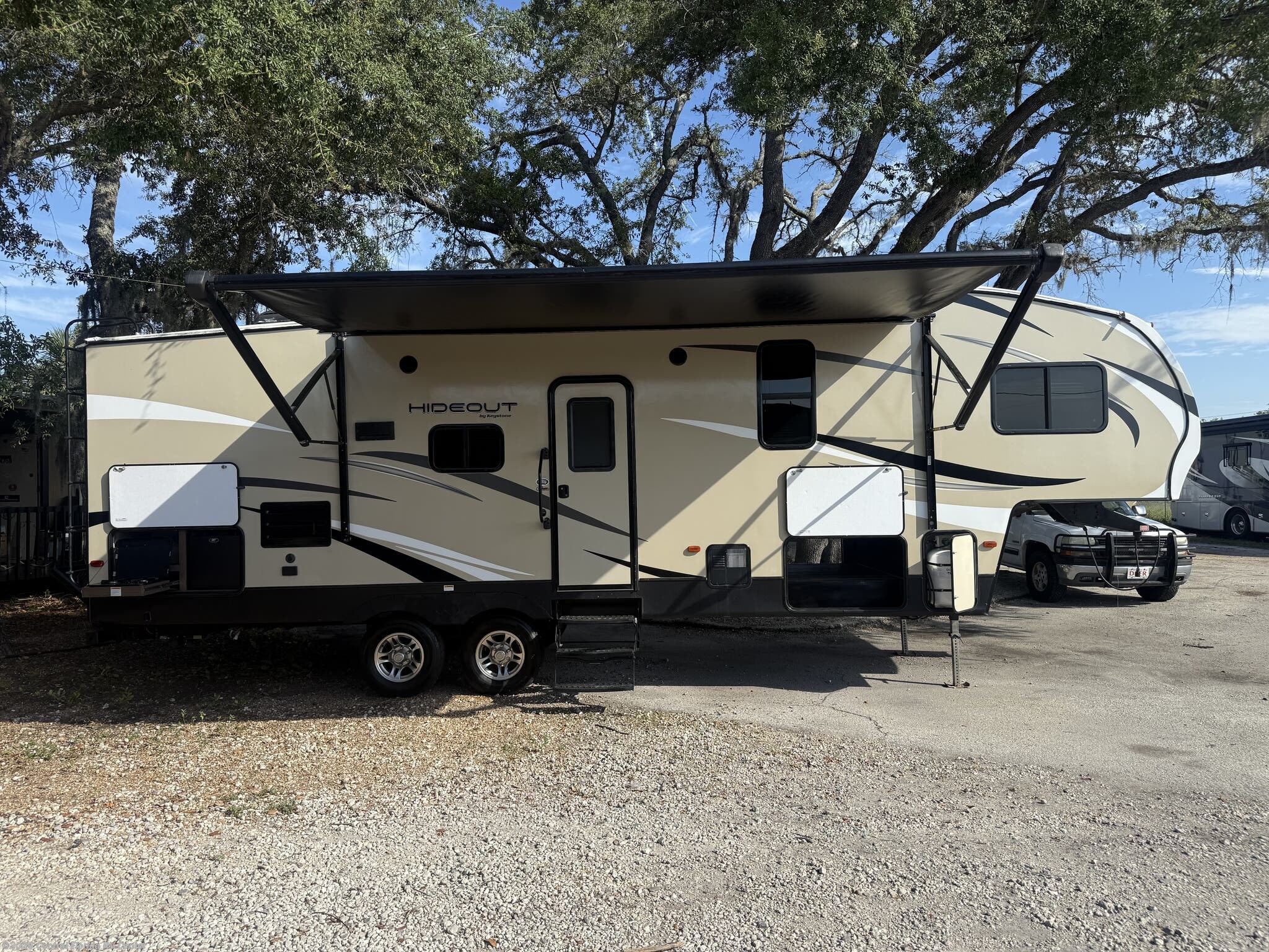 2018 Keystone Hideout 262RES 1 slide Fifth Wheel. This unit includes Entertainment Center, U Shaped Dinette, Queen Bed, outside kitchen, Pass Through Storage, Powered Awning & more!!