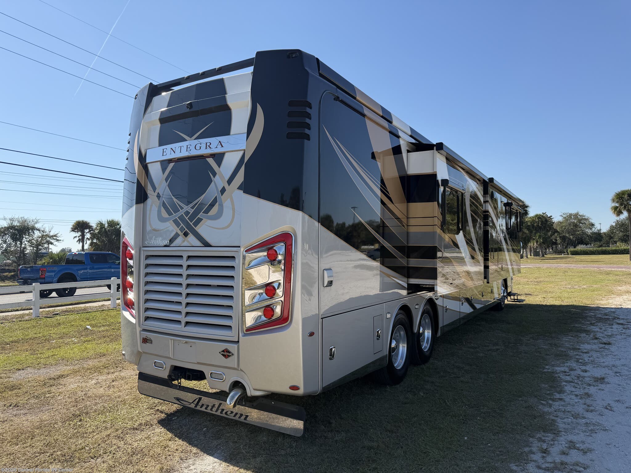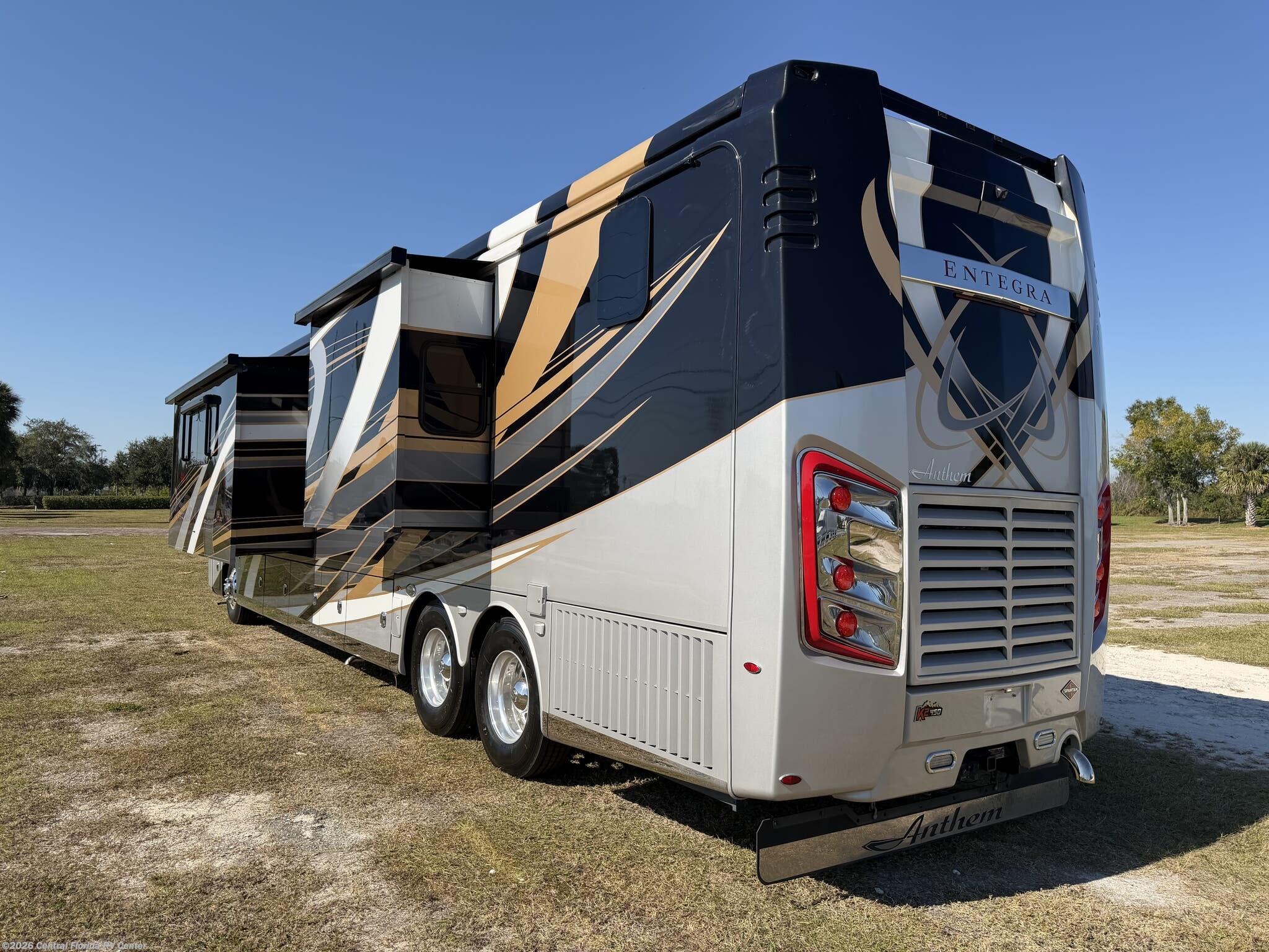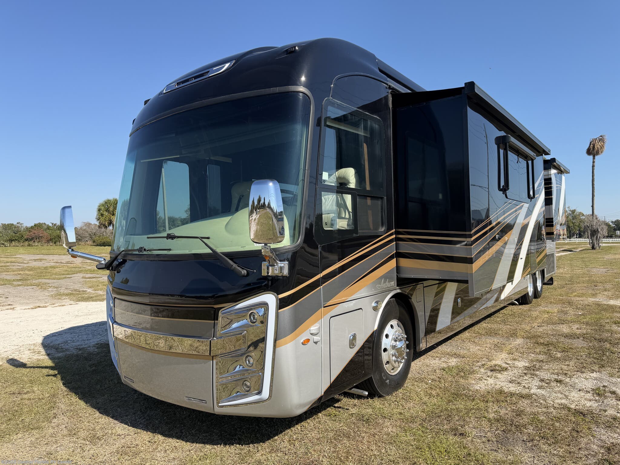 2019 Entegra Anthem 44B 4 slide motorhome with 17,233 miles. This coach is on a Spartan Chassis powered by a 450HP Cummins Diesel with Allison Transmission. This unit includes Entertainment Center with Fireplace, Dinette Table, Residential Refridgerator, Washer/Dryer, Aquahot w/ In Floor Heat, King Bed, Outside Entertainment & More!!