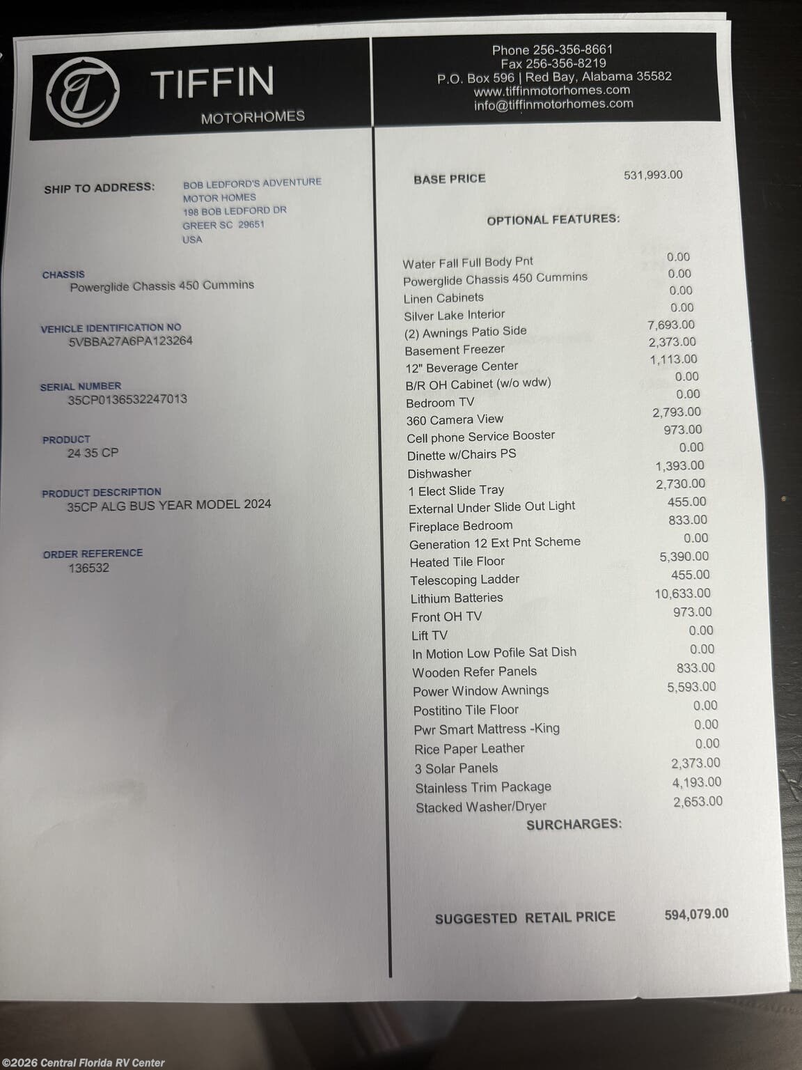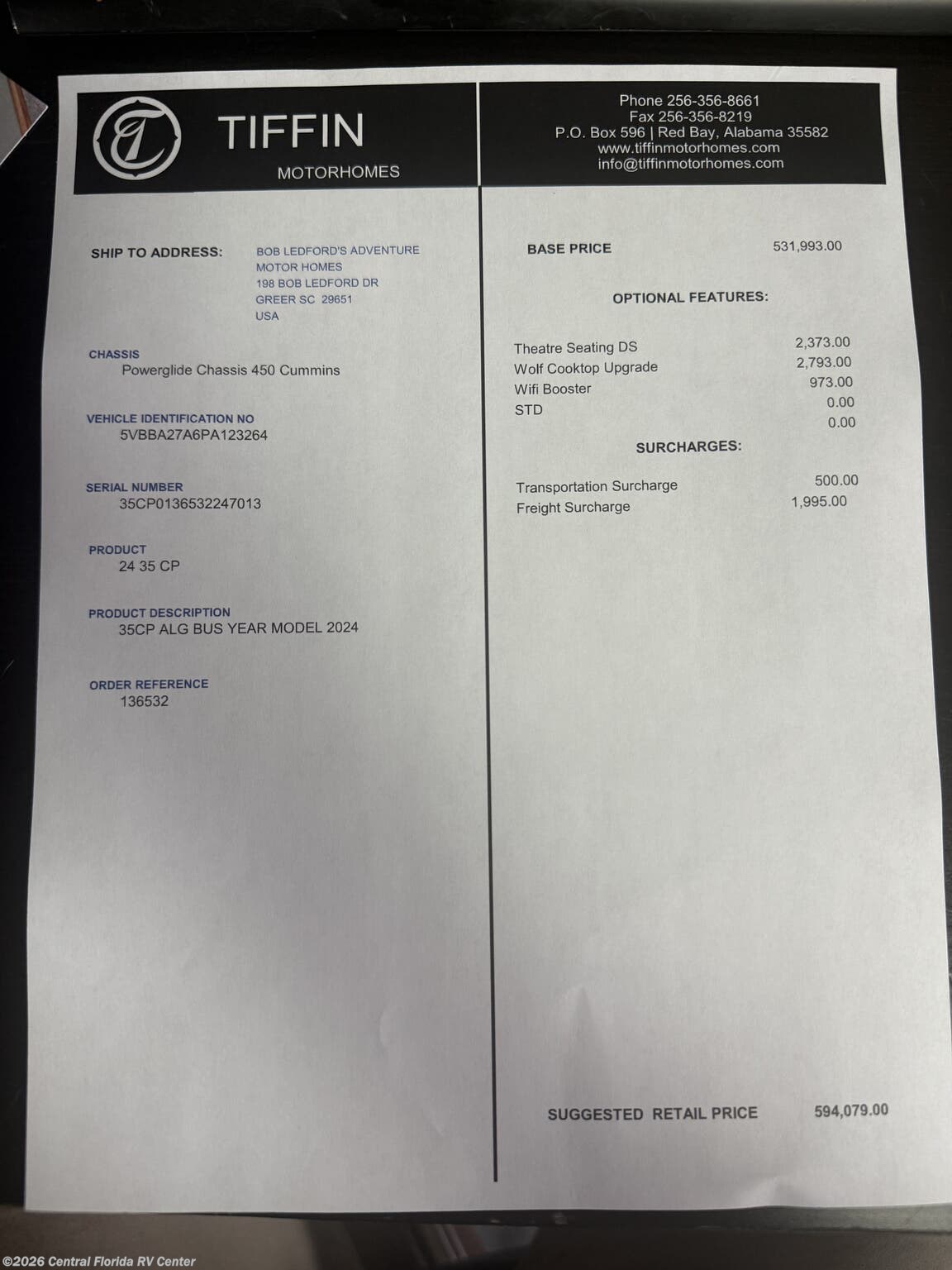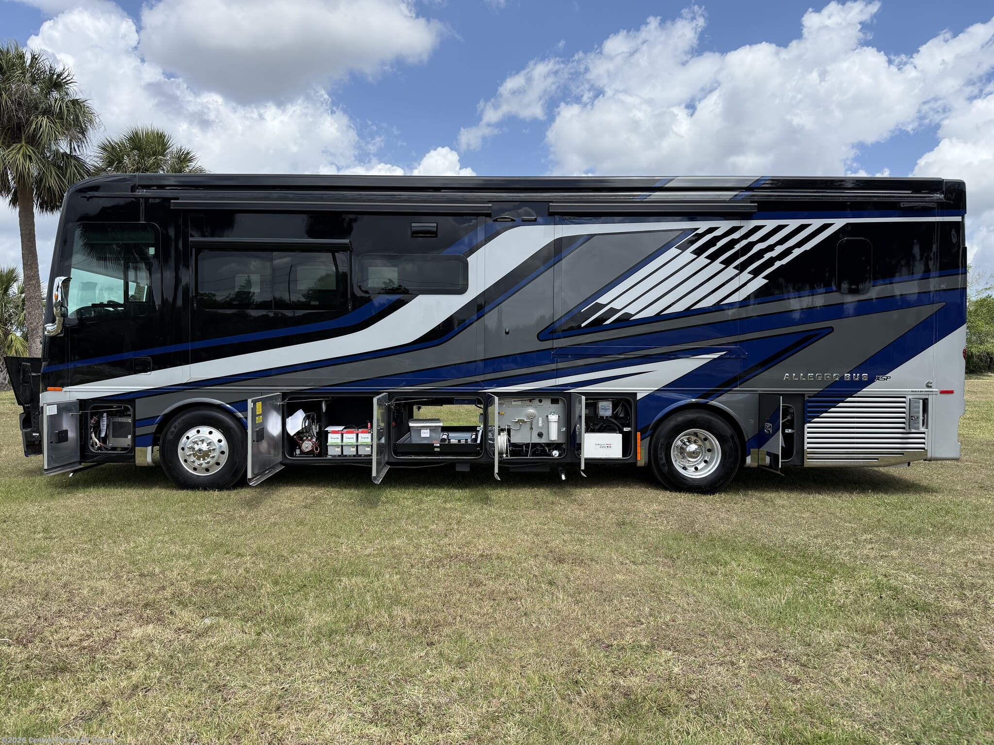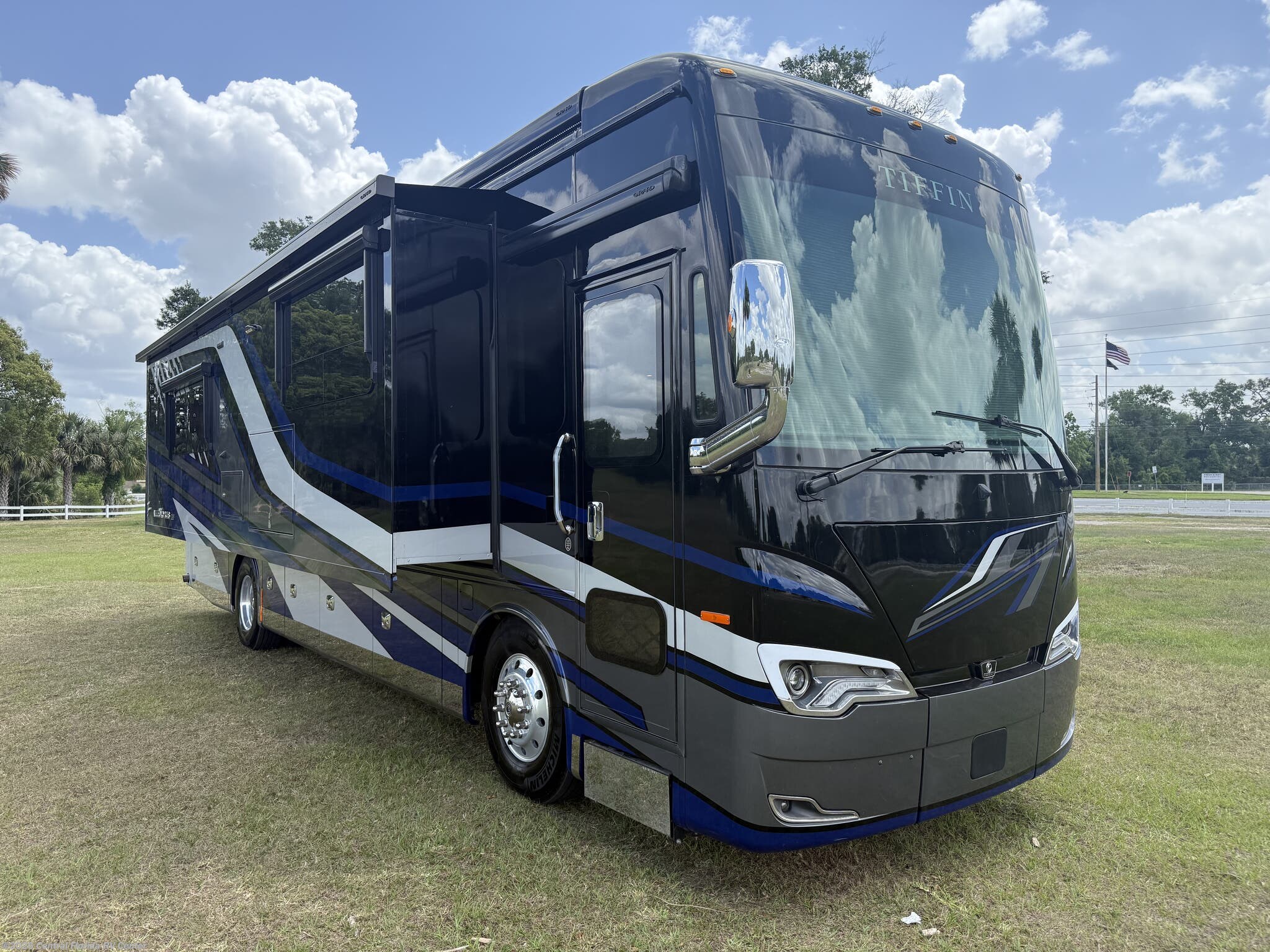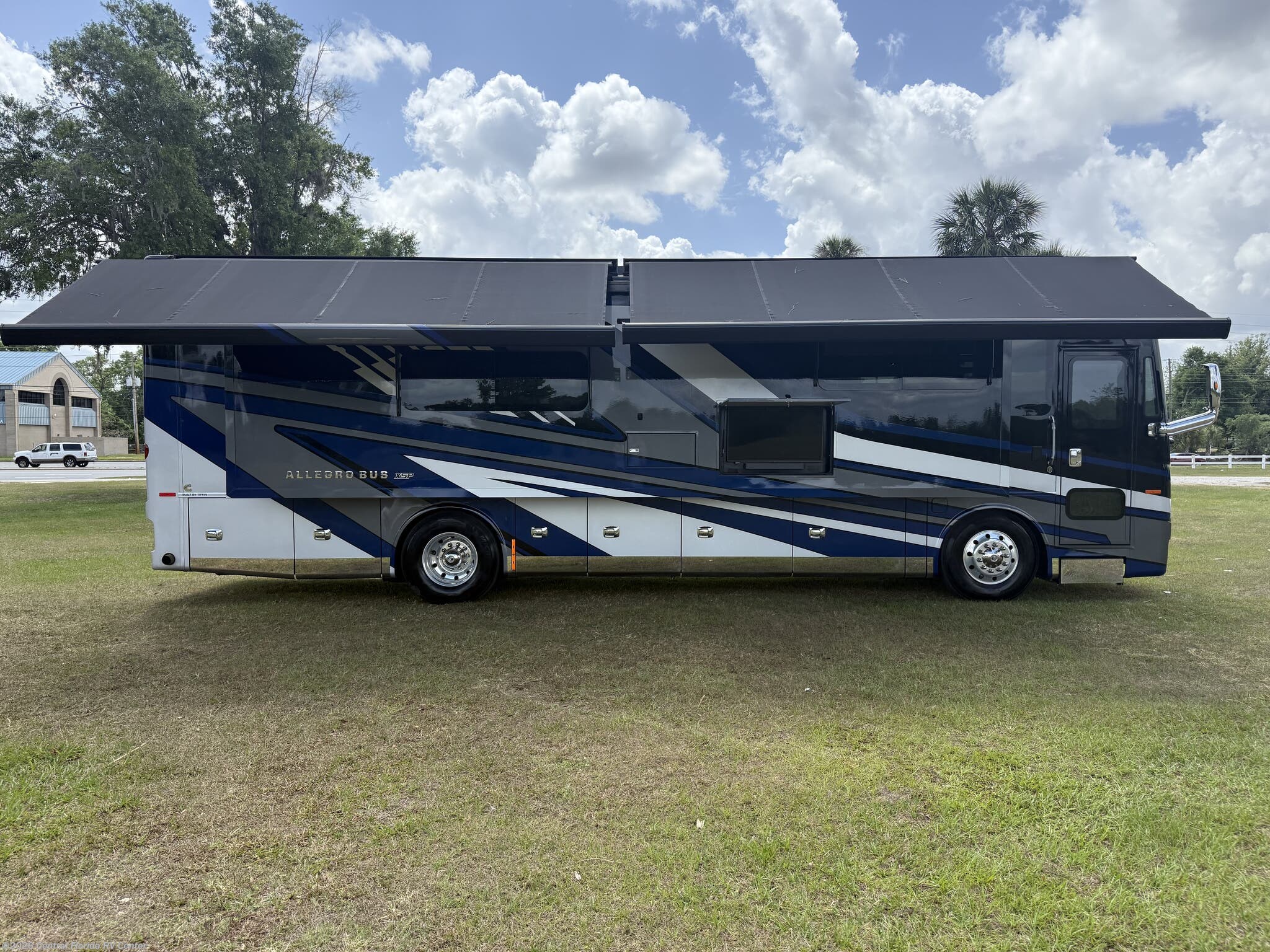 2024 Tiffin Allegro Bus 35CP 3 slide motorhome with 14,212 miles. This coach is on a Powerglide Chassis powered by a 450HP Cummins Diesel with Allison Transmission. This coach is fully loaded & includes 2 Patio Awnings, Basement Freezer, 12" Beverage Center, 360 Camera View, Cell phone service booster, Dishwasher, Pass through storage w/ electric slide tray, fireplace Bedroom, Heated Tile Floor, Lithium Batteries, Power Window Awnings, 3 Solar Panels, Stainless Trim package, stacked washer/dryer, Theatre Seating, King Bed & more!!